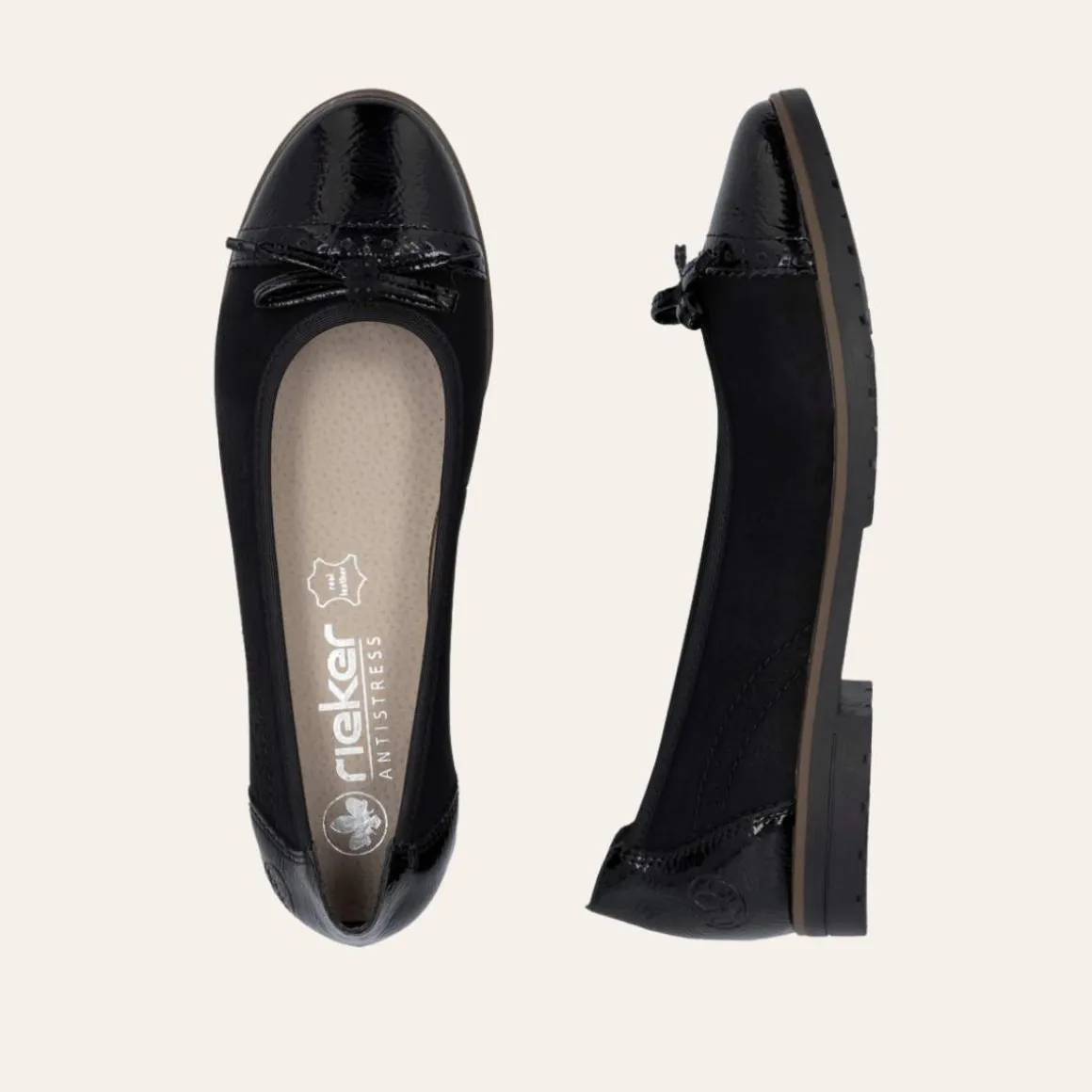 Rieker ballerinasko til dame i svart. Denne ballerinasko kombinerer moderne design med tidløs eleganse. Den klassiske svarte fargen kompletteres vakkert av skinnende lakdetaljer og en fin sløyfe, som gir skoen et elegant preg.