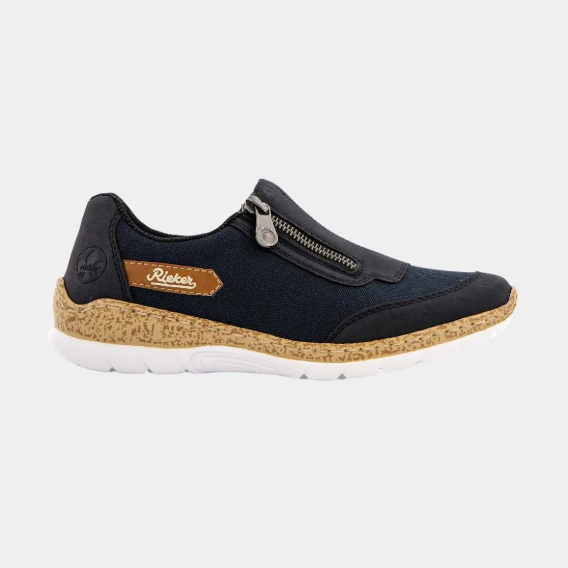 Med denne hverdagsskoen viser Rieker nok en gang at design og funksjon ikke utelukker høy bærekomfort. Slip-on-sko med glidelås og en praktisk strikk og en myk memo-fotseng, som tilpasser seg perfekt til fotformen.