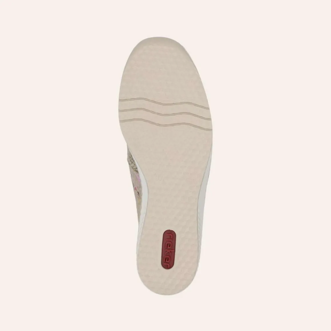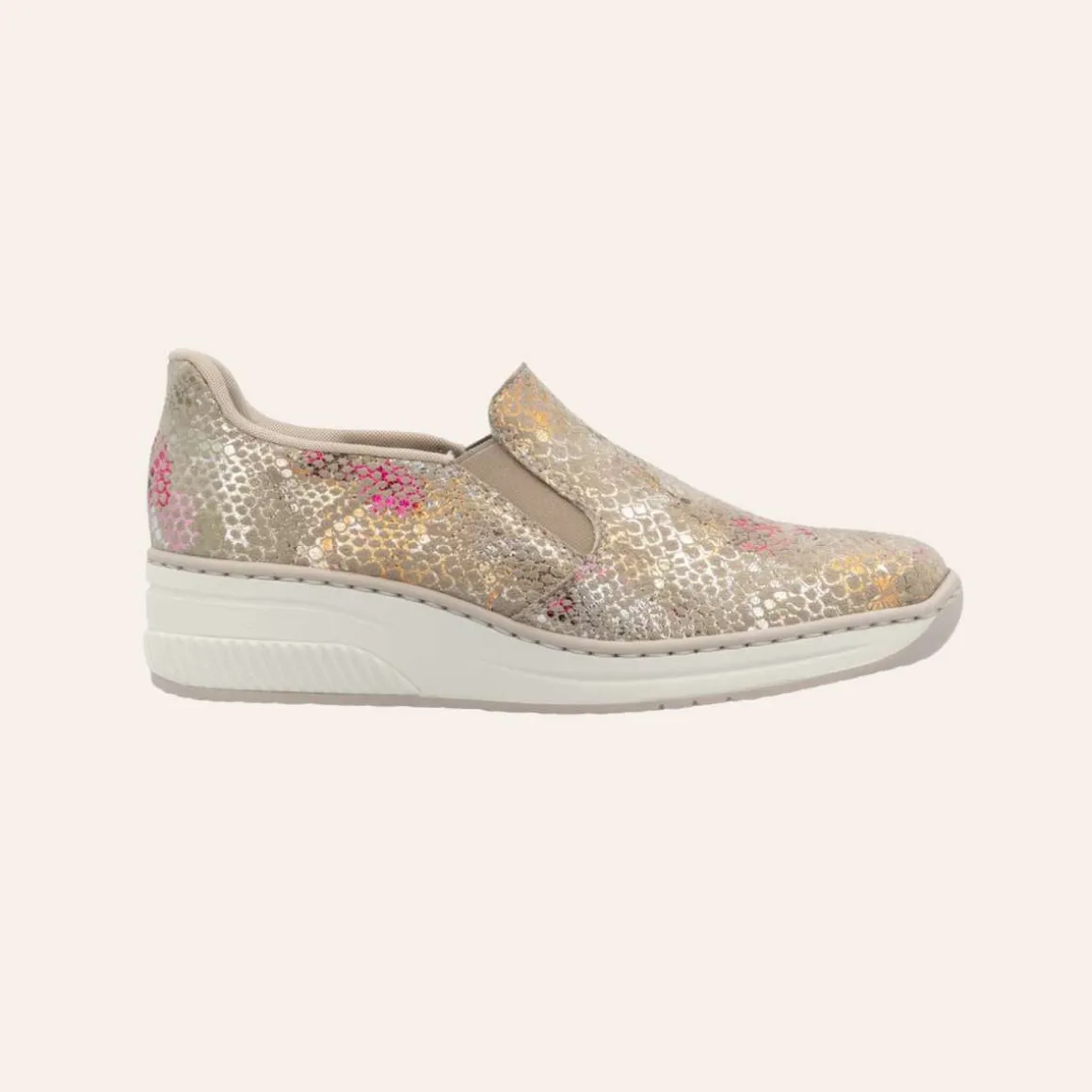 Disse skoene fra Rieker kombinerer stil og funksjonalitet. De vakre fargene danner et elegant mønster som tilfører et eksklusivt uttrykk. Med Hands Free Ready 2 Go-teknologien kan skoene enkelt tas på uten å bruke hendene, takket være den faste hælkappen. Elastikkene ved åpningen gir en behagelig passform, mens den myke skinnsålen med stødabsorbering sikrer komfort hele dagen. Kilehælen på 4,5 cm gir et feminint og moderne preg.