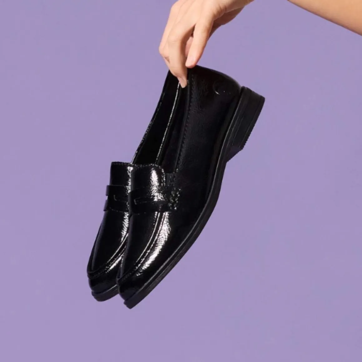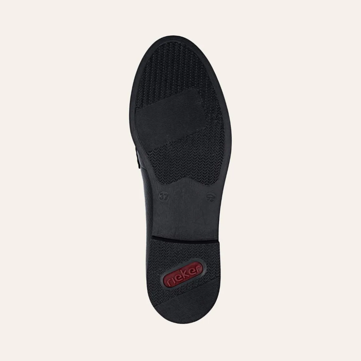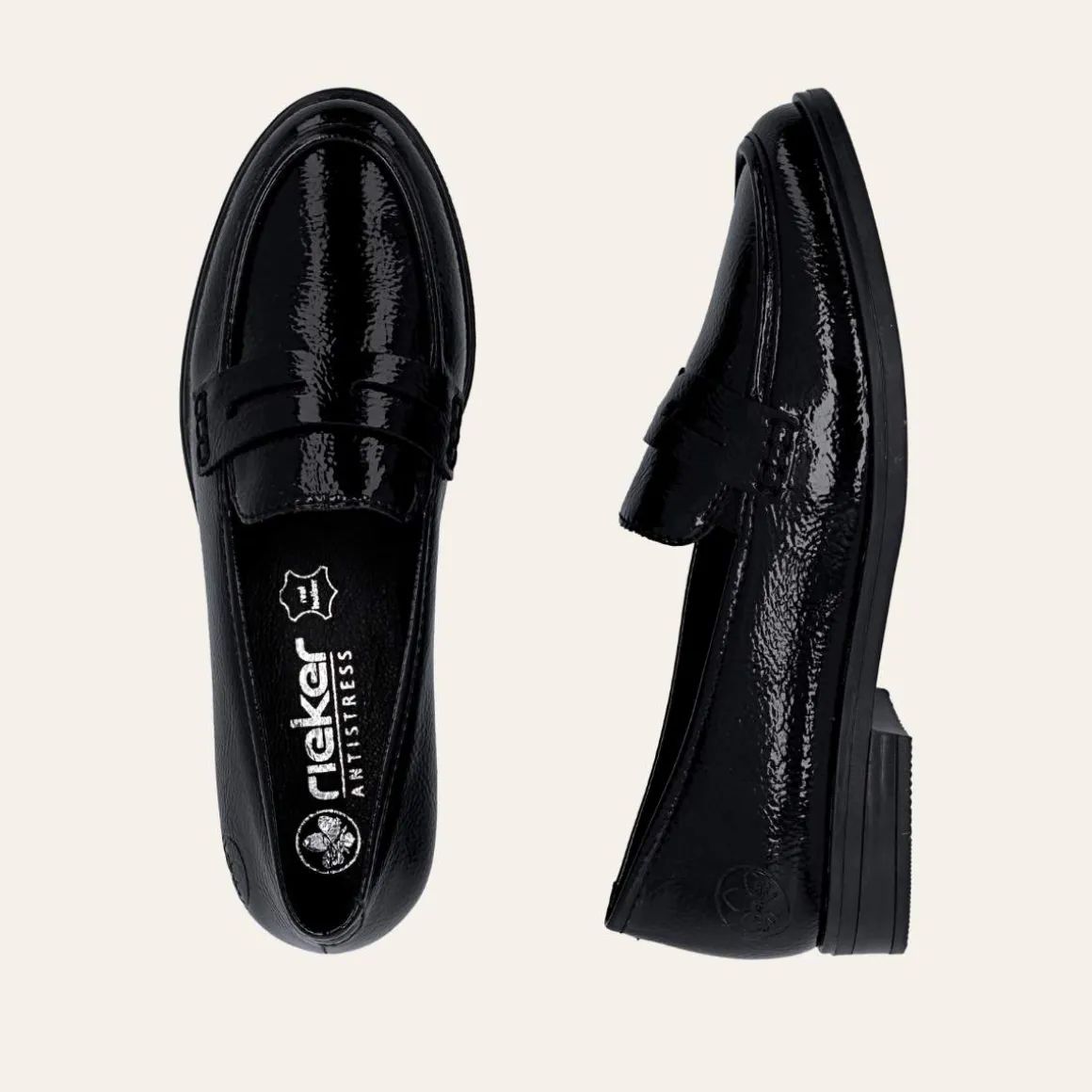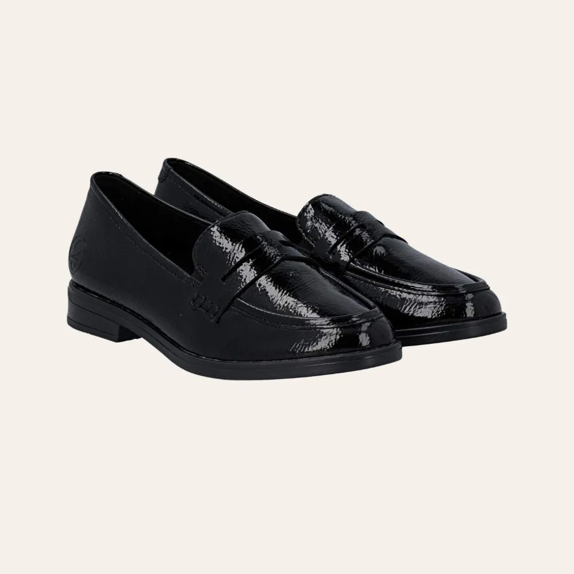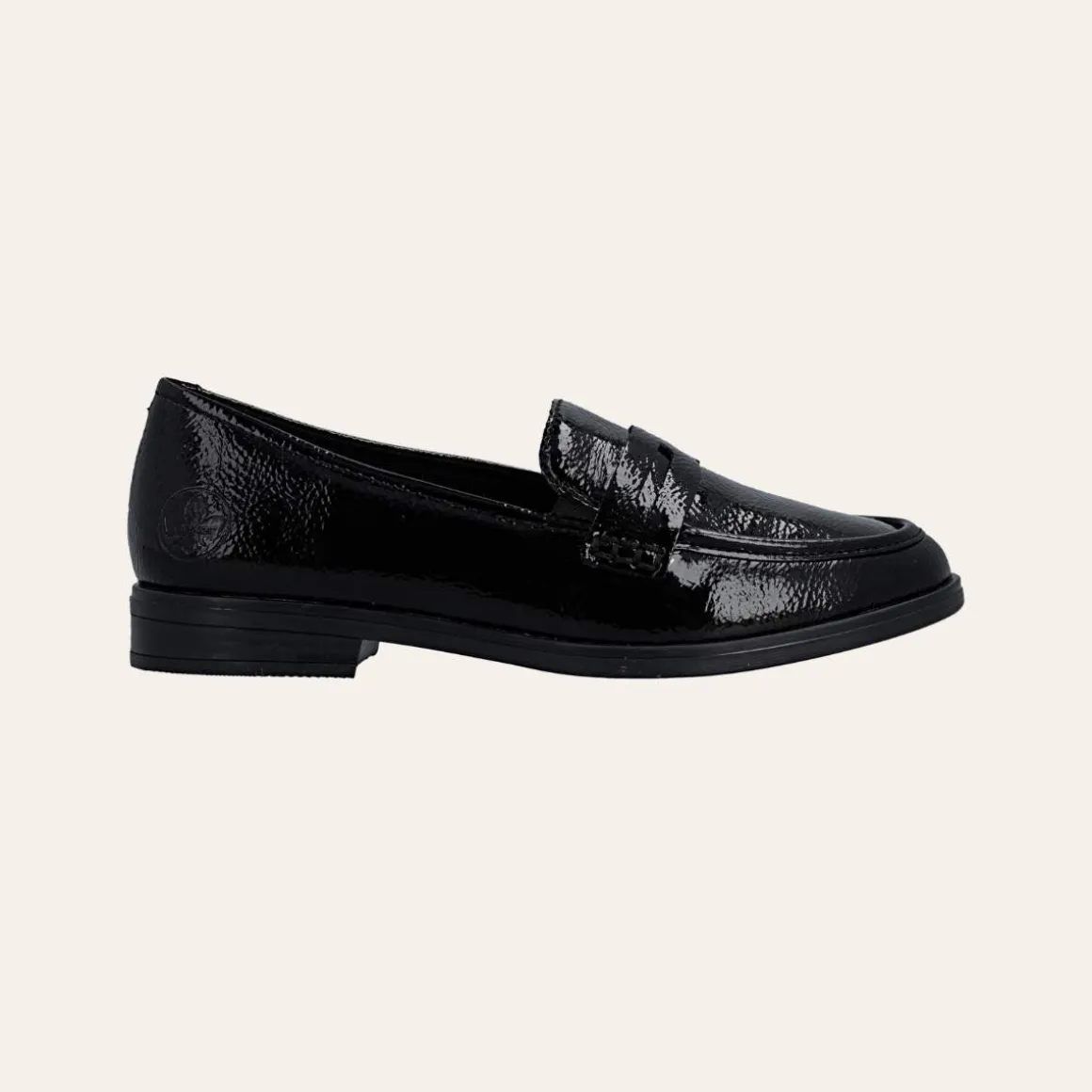 Elegante loafers fra Rieker i sort lakk som kombinerer klassisk stil med høy komfort. Den glansfulle lakoverdelen og de rene linjene gjør skoen enkel å style både til hverdagsantrekk og mer pyntede anledninger.