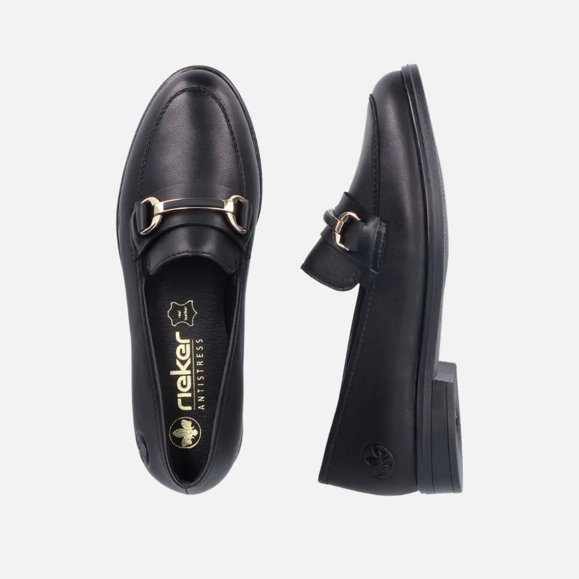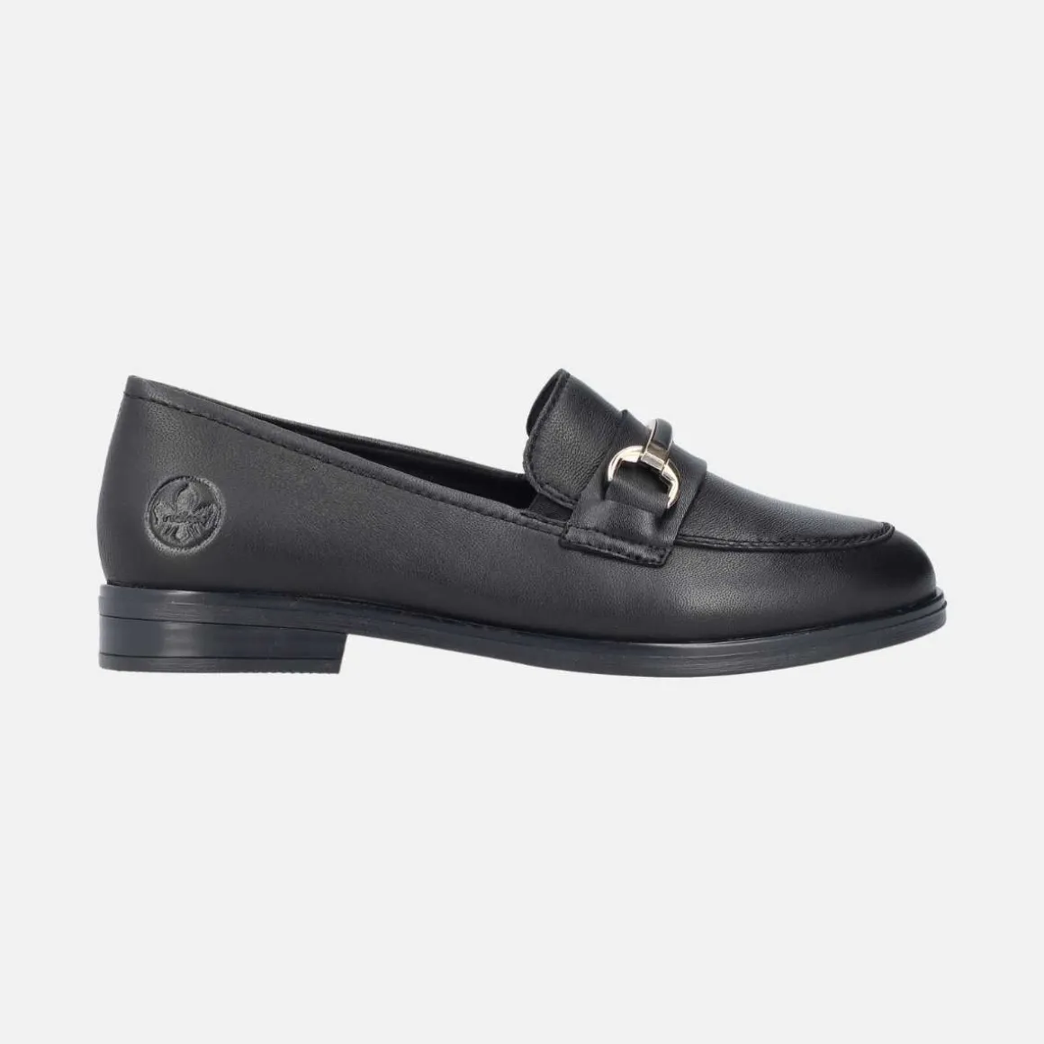 Disse sorte Rieker mokasinene for damer i glatt skinn overbeviser med moderne design og høy komfort. Modellen har ingen lukking og kan derfor tas på i en fei. Det moteriktige smykkeelementet er en ekte blikkfang. Den gripevennlige sålen gir optimalt grep på hvert steg. I tillegg sørger den ekstra myke innersålen for ekstra komfort.