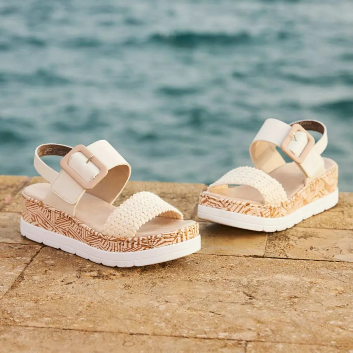 Disse lyse beige kilesandalene fra Rieker gir føttene dine plass til å bevege seg mens de fortsatt holder dem sikre. Brede stropper og en borrelåsfeste sammen med en smal hælrem gir optimal støtte. Den lette og støtdempende plattformsålen skjemmer også bort føttene ved hvert steg. Et annet pluss er den ekstra myke deksålen.