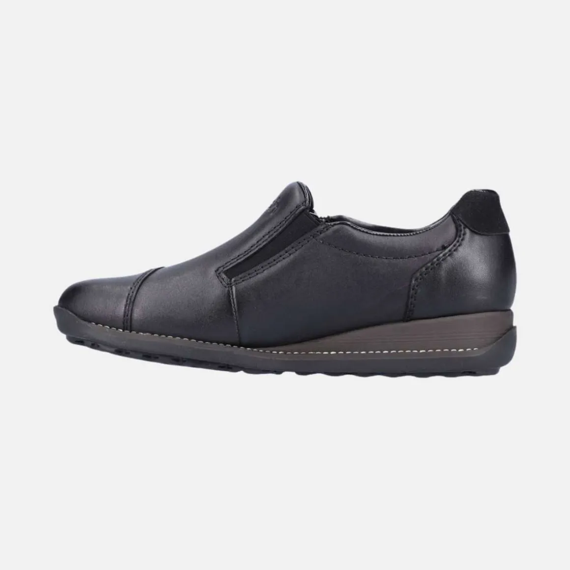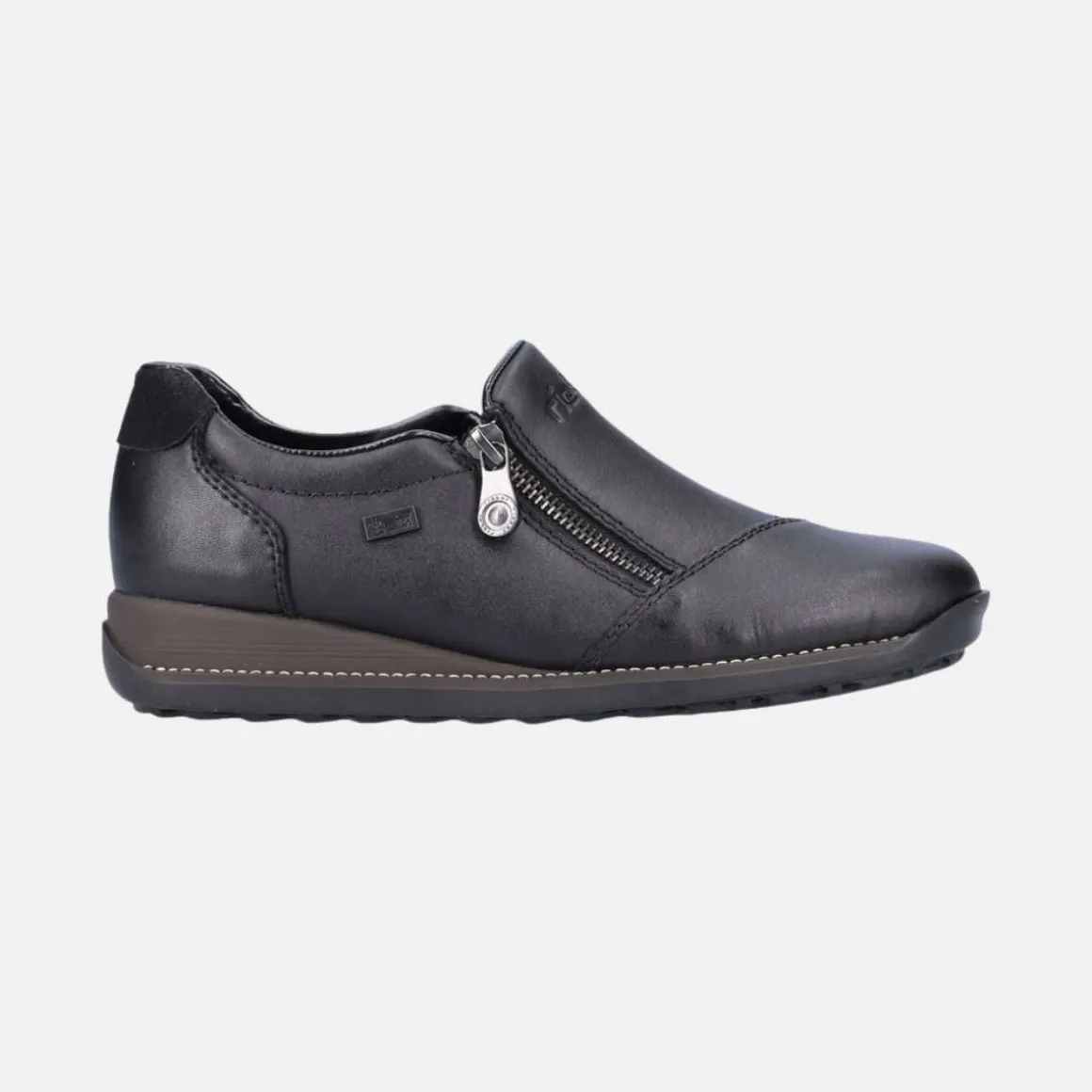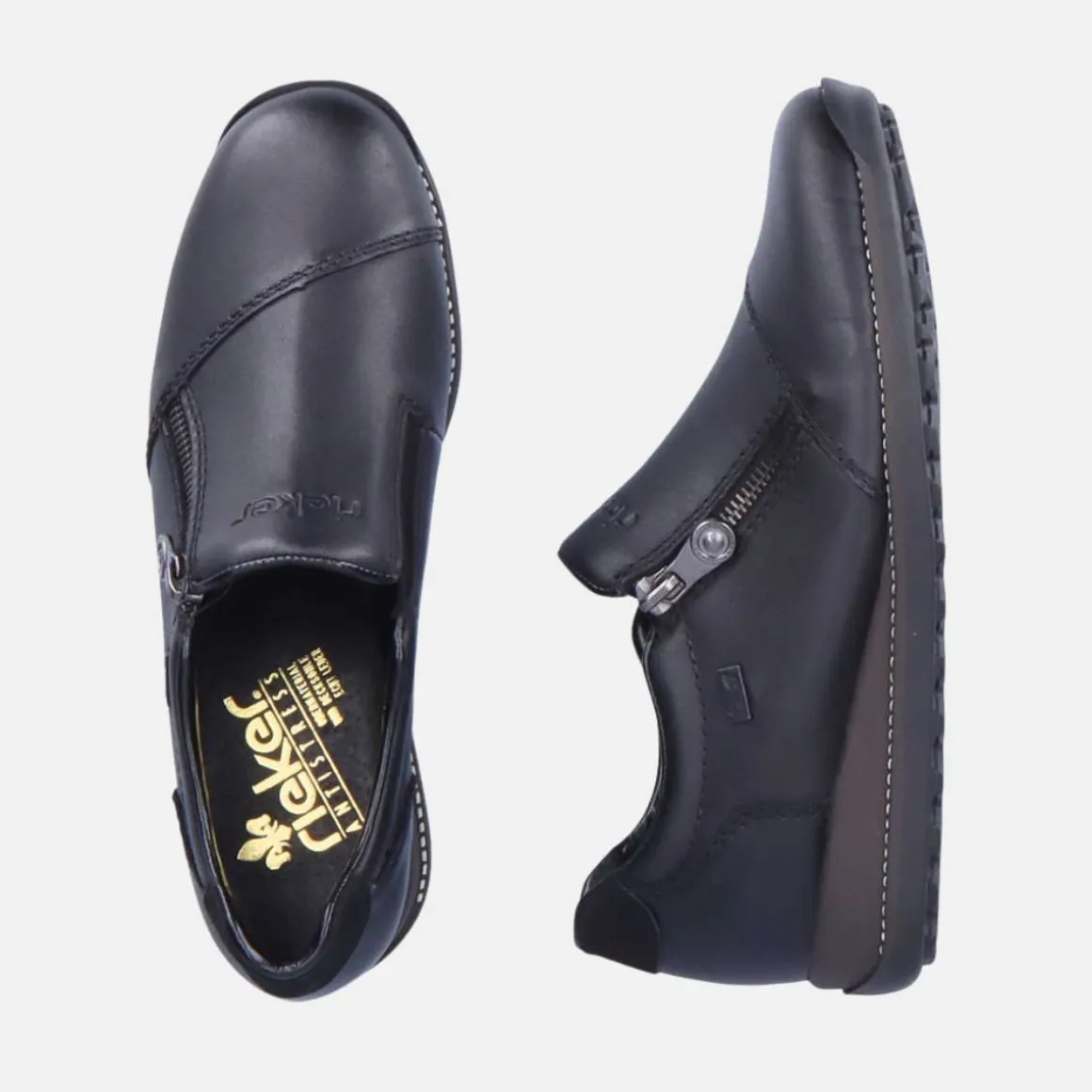 All-time favorite fra Rieker! Disse svarte skoene i glatt skinn imponerer med sitt klassiske design og høye komfort. En sideglidelås gjør det raskt og enkelt å ta dem på. Skoen har en robust profilsåle som gir godt grep for et sikkert steg. Takket være den smale E 1/2 passformen sitter skoen komfortabelt tett uten å klemme. RiekerTEX-teknologien holder føttene tørre i kaldt og fuktig vær.