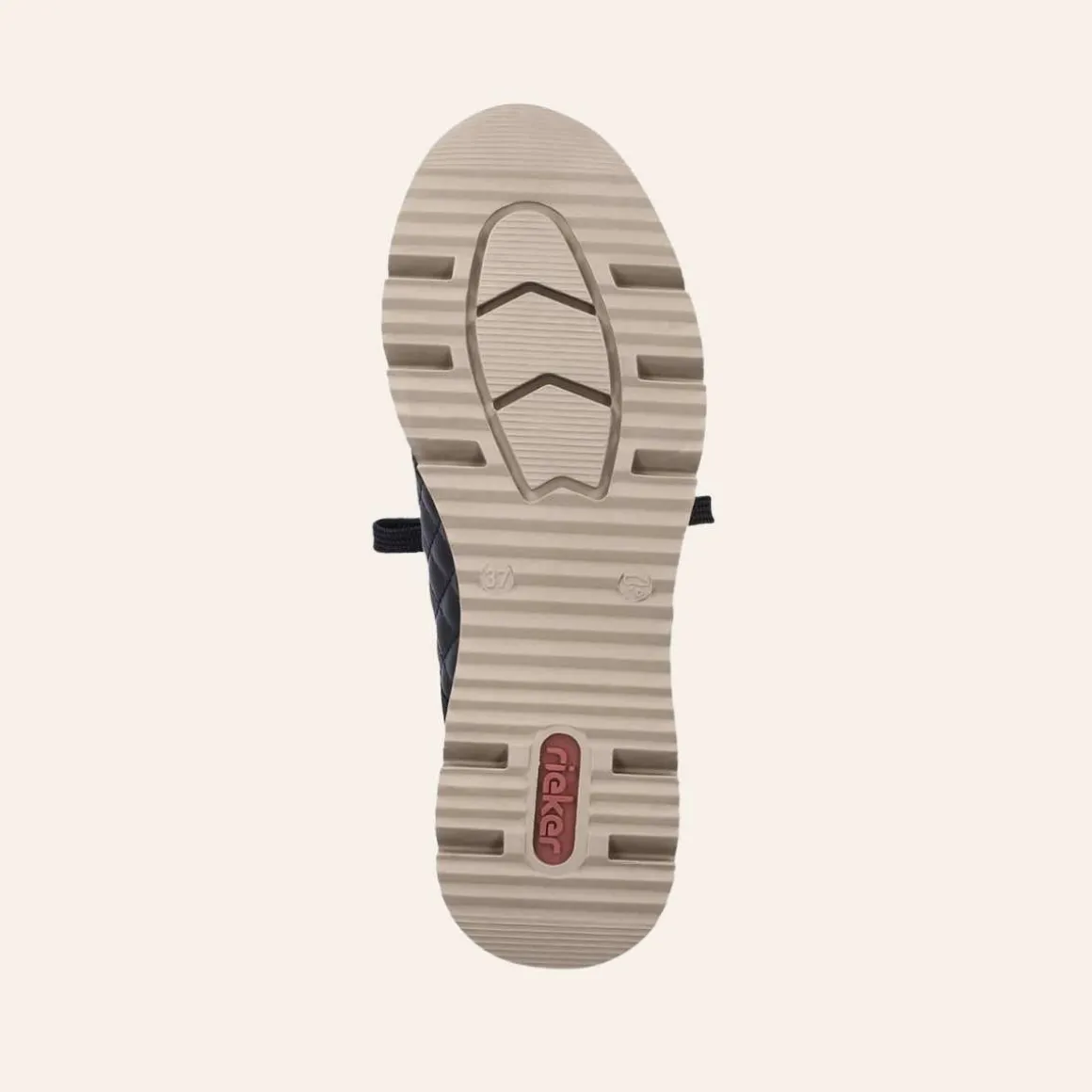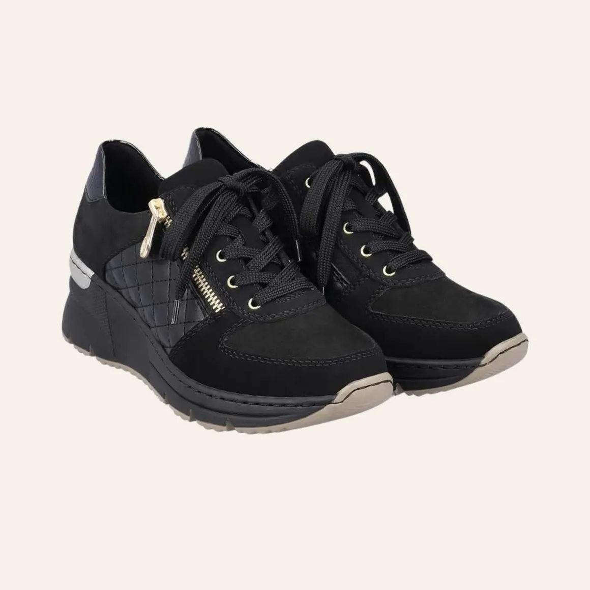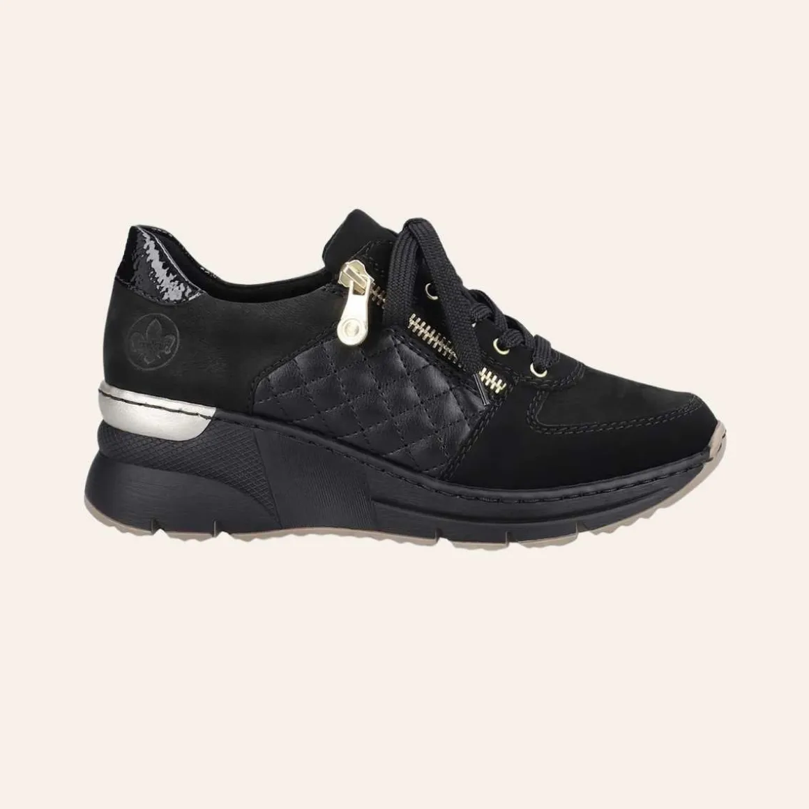 Lekre sneakers fra Rieker i sort skinn med gulldetaljer. Modellen har lisser og glidelås på utsiden, slik at du enkelt og raskt kommer inn i den. Skoen har en liten kilehæl på ca. 4 cm, som sammen med en støtdempende bunn bidrar til støtte for føttene dine.