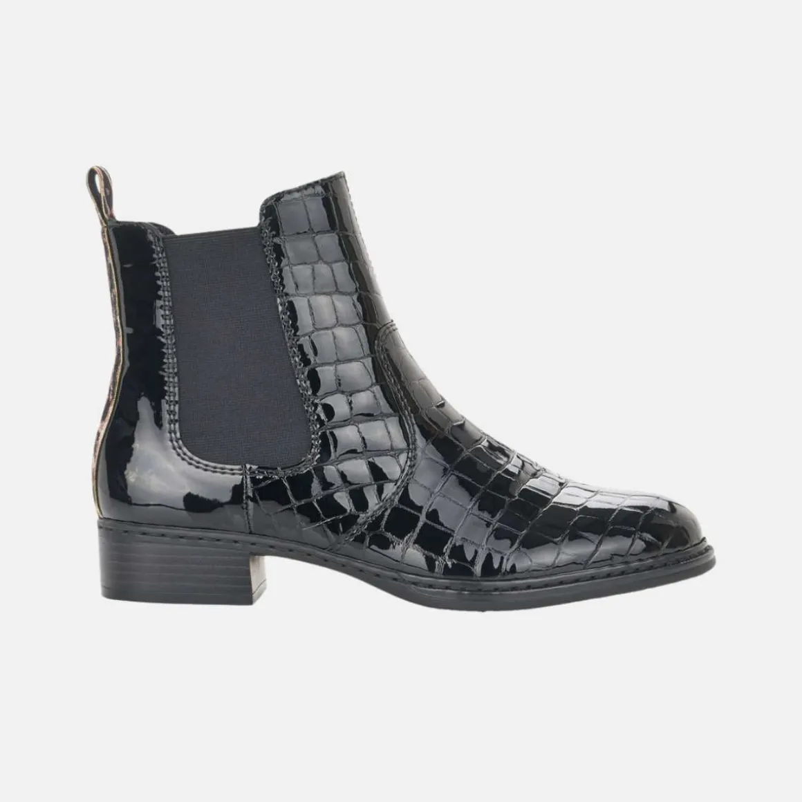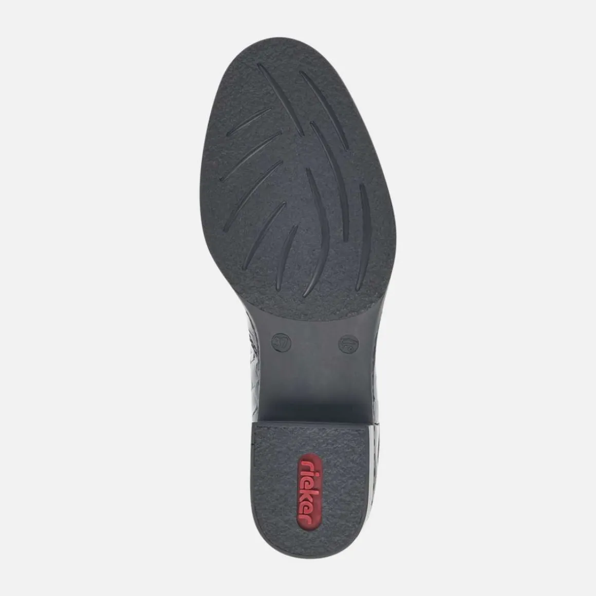 Flott Rieker boot i lakkskinn. Superfint print på hempen på baksiden av skoen. Strikk på begge sider for enkel bruk.