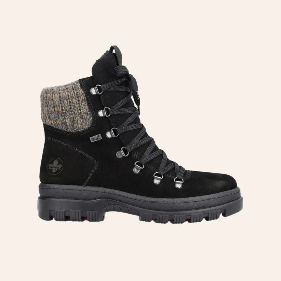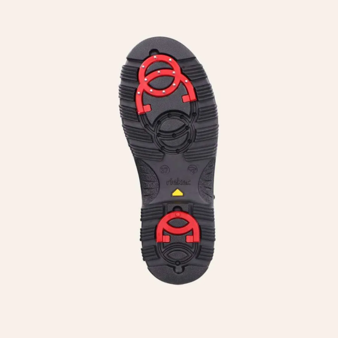 Rieker vintersko med vendbare pigger undere sålen. Varmforet med membran som beskytter mot vann og snø. Glidelås på innsiden, og lisser på fremsiden for optimal passform.