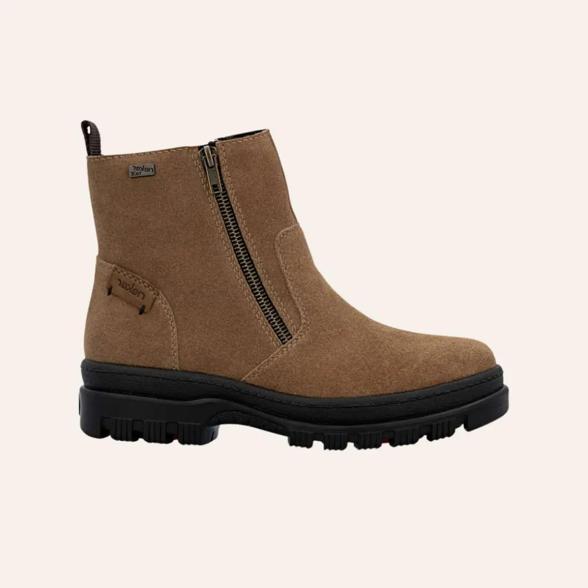 Oppdag allsidigheten med Rieker piggsko som kombinerer eleganse med praktisk funksjonalitet. Laget av mykt, ekte skinn, gir disse støvlene både stil og komfort. Den varme og myke ullfôringen holder føttene dine varme, mens den vannavvisende RiekerTex-membranen sørger for at føttene dine holder seg tørre.