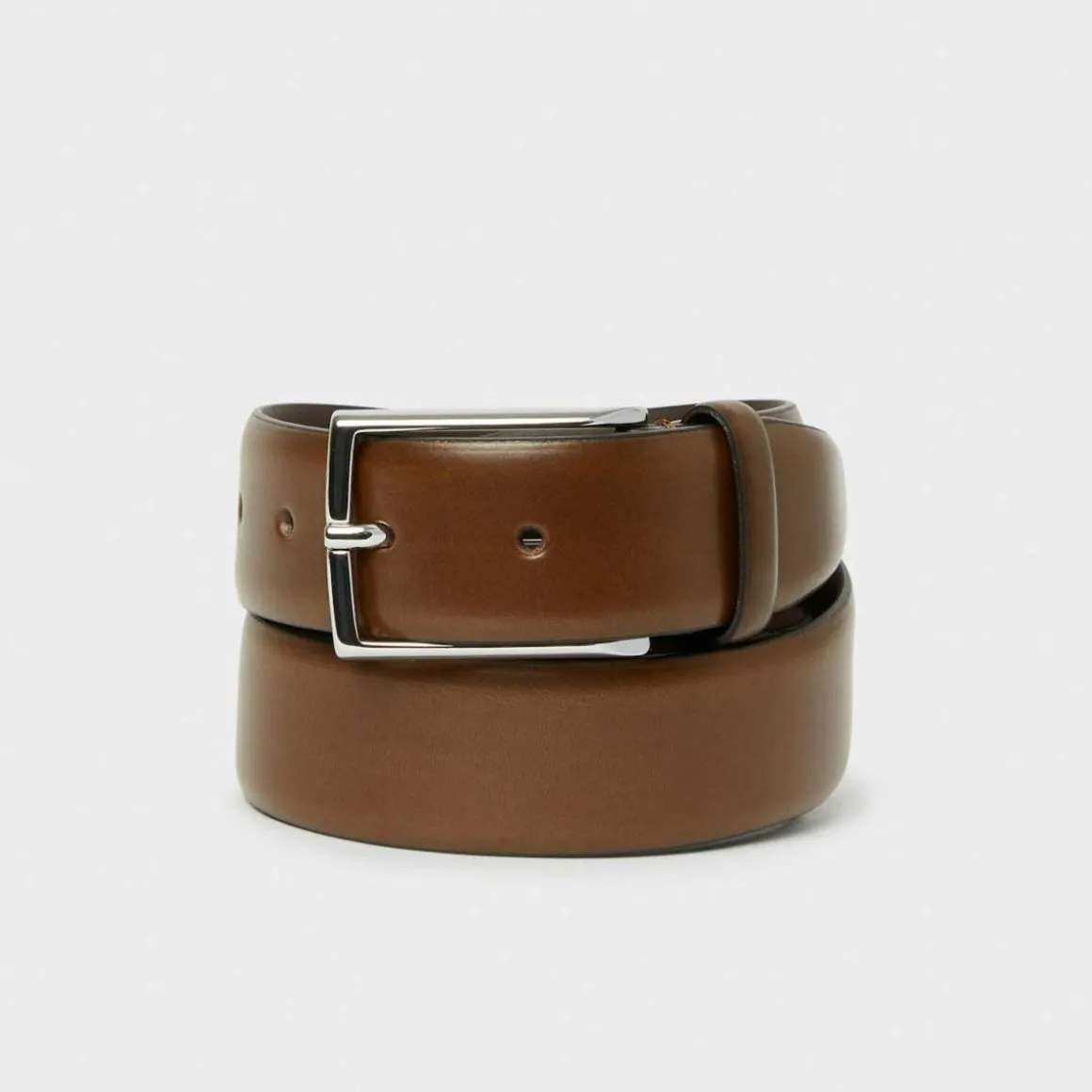 Skinnbelte Cederlund fra Saddler. Stilrent dressbelte til herre i vegetabilsk garvet fullnarvet skinn, laget i Italia. Skinnet har en glatt finish med en naturlig glans som sammen med den skinnende, sølvfargede metallspennen gir den et pyntet og sofistikert preg. Skinnet i dette produktet er av høyeste kvalitet og har blitt behandlet i et garveri som er sertifisert av Leather Working Group.