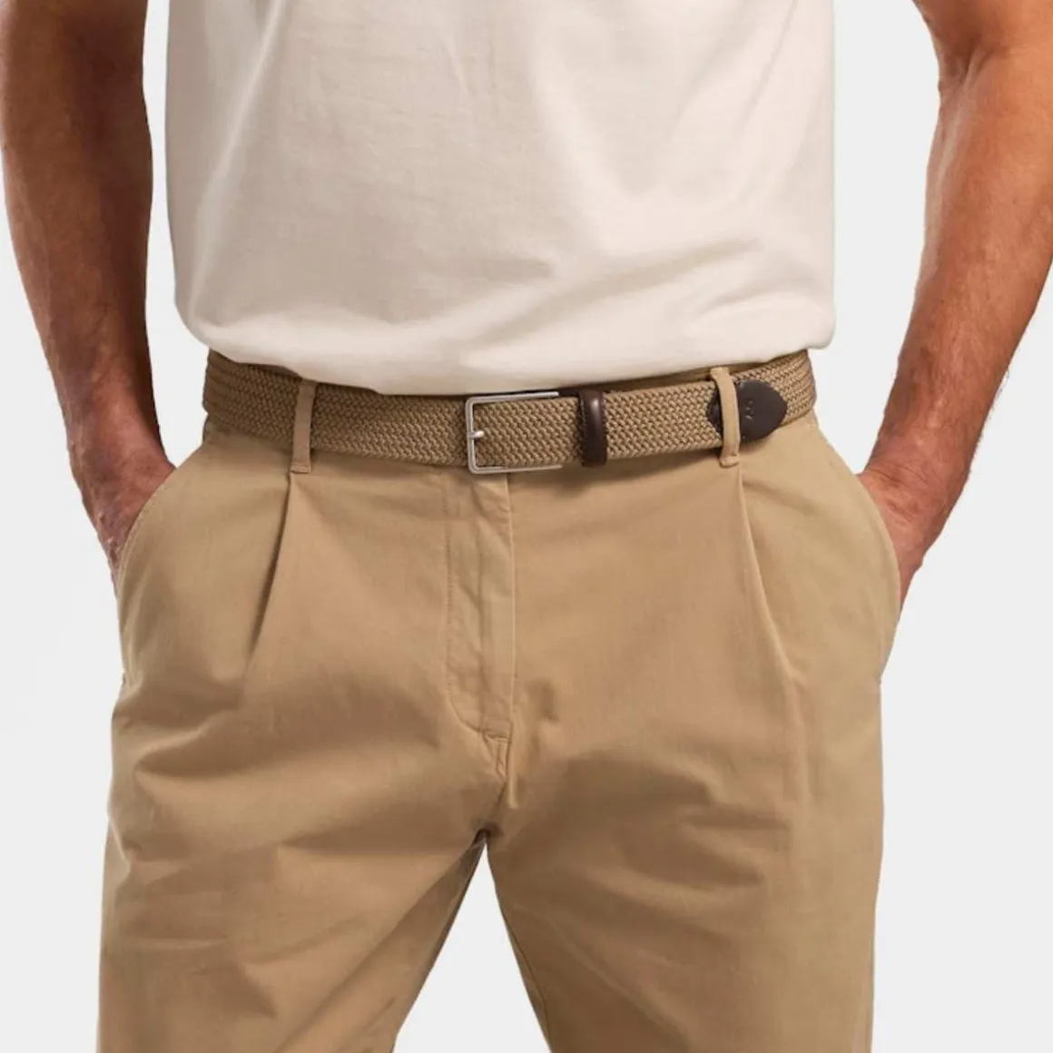 Tekstilbelte Marstrand fra Saddler. Elastisk herrebelte med detaljer i vegetabilsk garvet fullnarvet skinn, laget i Italia. Fint belte flettet i tekstil med en stilren spenne i børstet metall. Elastisiteten til beltet gjør at det er behagelig å ha på. Beltet er et stilig tilbehør til et par jeans eller chinos for en hverdagslig, men pyntet look. Spenne i børstet sølvfarget metall. Skinnet i dette produktet er av høyeste kvalitet og har blitt behandlet i et garveri som er sertifisert av Leather Working Group. Materialet i beltet er elastisk, så hvis du skal velge mellom to størrelser, anbefaler vi at du velger den minste.