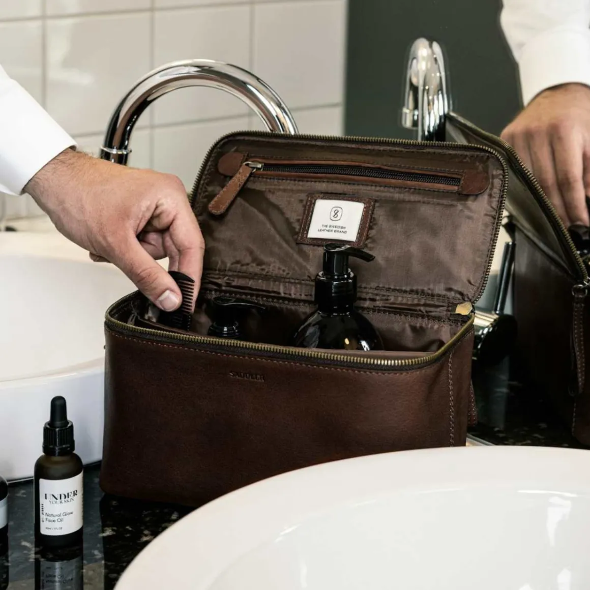 Toalettveske Barolo fra Saddler. Luksuriøs og romslig mannlig toalettartikler i høy kvalitet skinn som er perfekt for den organiserte personen. Innsiden har en divider i midten og lokket har en lomme som lukker med glidelås.