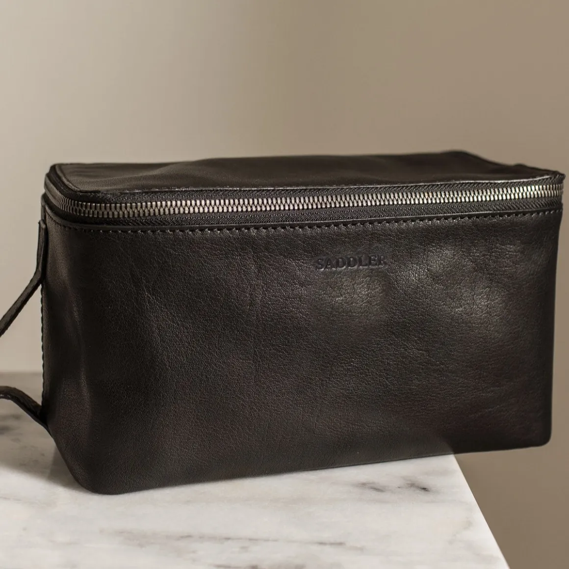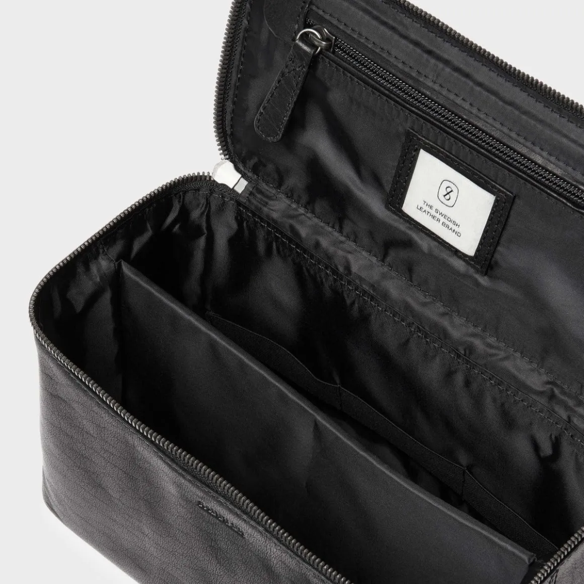 Toalettveske Barolo fra Saddler. Luksuriøs og romslig mannlig toalettartikler i høy kvalitet skinn som er perfekt for den organiserte personen. Innsiden har en divider i midten og lokket har en lomme som lukker med glidelås.