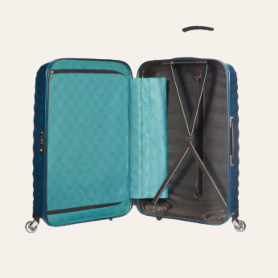 Samsonite Lite-Shock koffert. Denne harde koffertens selvforsterkede, organiske design og ultralette komfortkomponenter har gitt en ekstra lett bagasjekolleksjon som setter en ny standard. Designens støtabsorberende natur sørger for at Light-Shock er sterk selv uten et tykt utvendig skall.