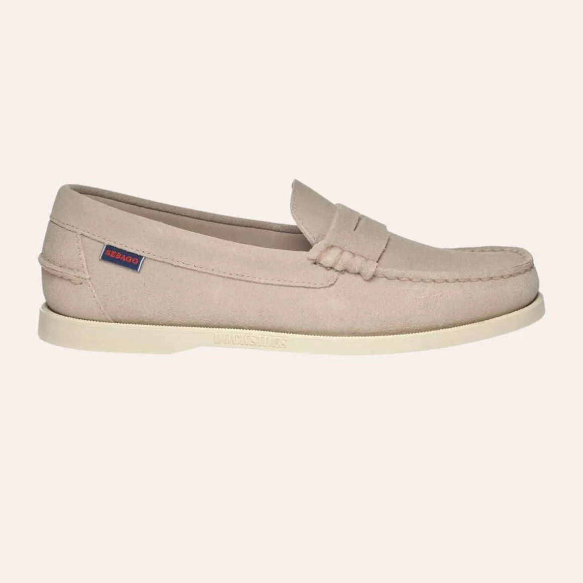 Sebago Dan. Laget av en myk, men tykk og slitesterk semsket kvalitet, og håndsydd med det fineste håndverket. Disse sommerlige slip-on «beefroll» penny loafer-mokasinene for damer er designet med tanke på den finere, feminine foten. De har uforet overdel, innersåle i skinn, og en ikke-merkende, sklisikker gummisåle med riller, typisk for båtsko, som gir stabilt grep under alle værforhold.