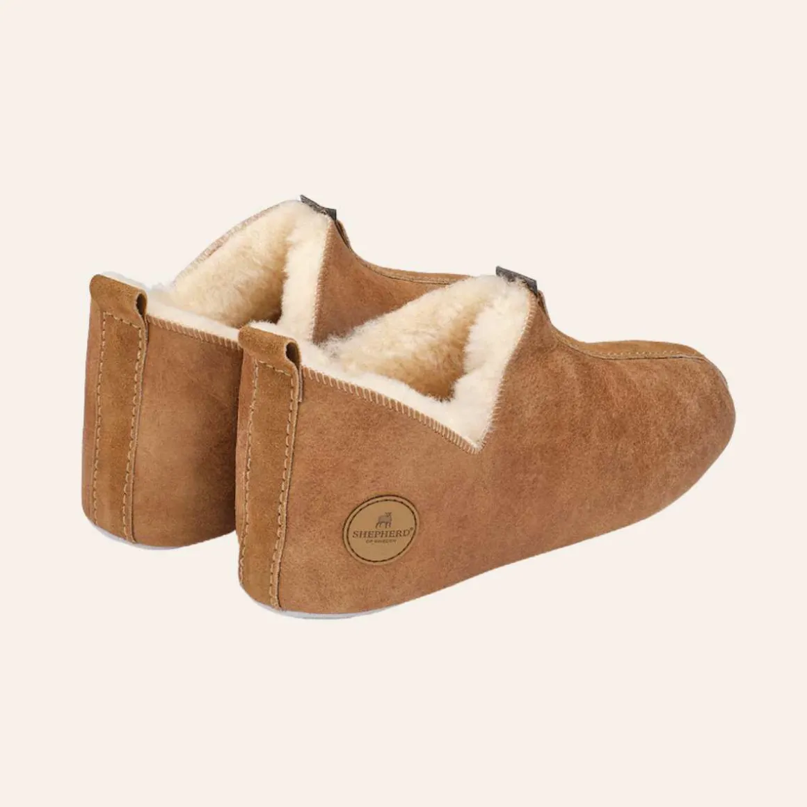 Shepherd Lina er et par myke og oppvarmende dametøfler i saueskinn. Tøflene er i en lav ankelmodell med en liten spalte i sidene, noe som gjør dem enkle å ta av og på. Dekorativ kant i semsket skinn og skjenking. Myk såle og semsket skinn.