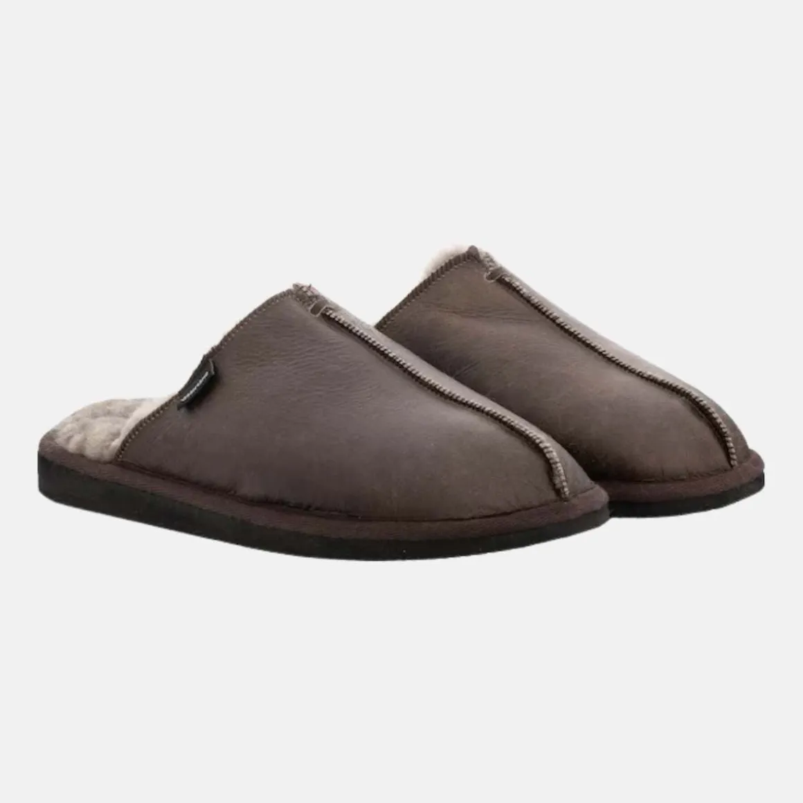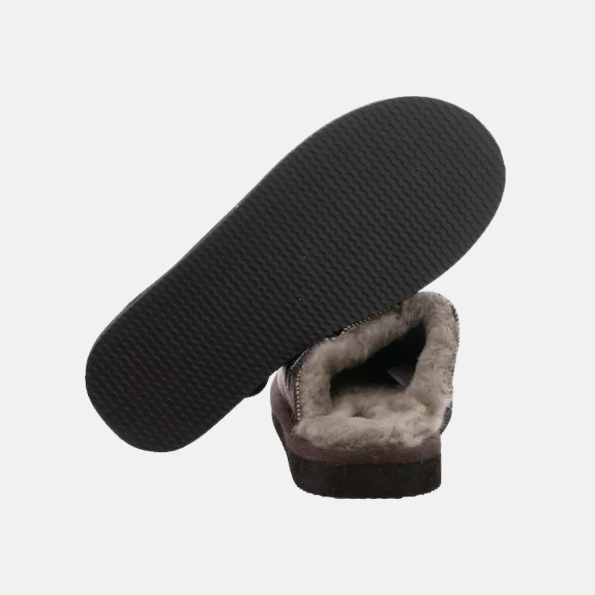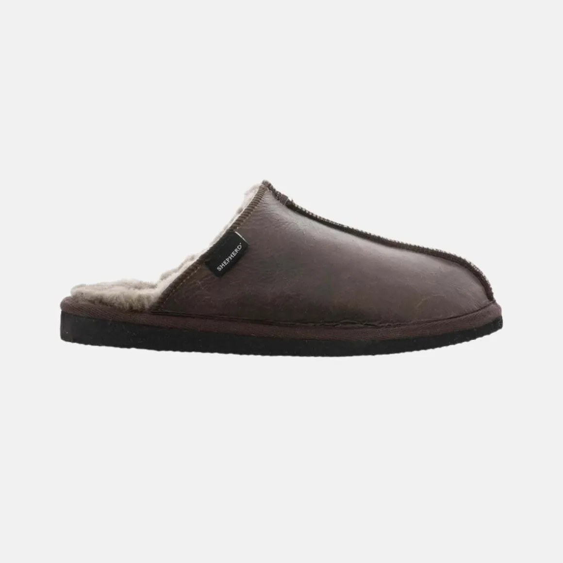 Shepherd Hugo er et par varme menns tøfler i saueskinn. Tøflerne er i en klassisk slip-in-modell med en liten spalte foran og en dekorativ overflatesøm. Tekstilkant rundt sålen. Yttersåle i EVA.