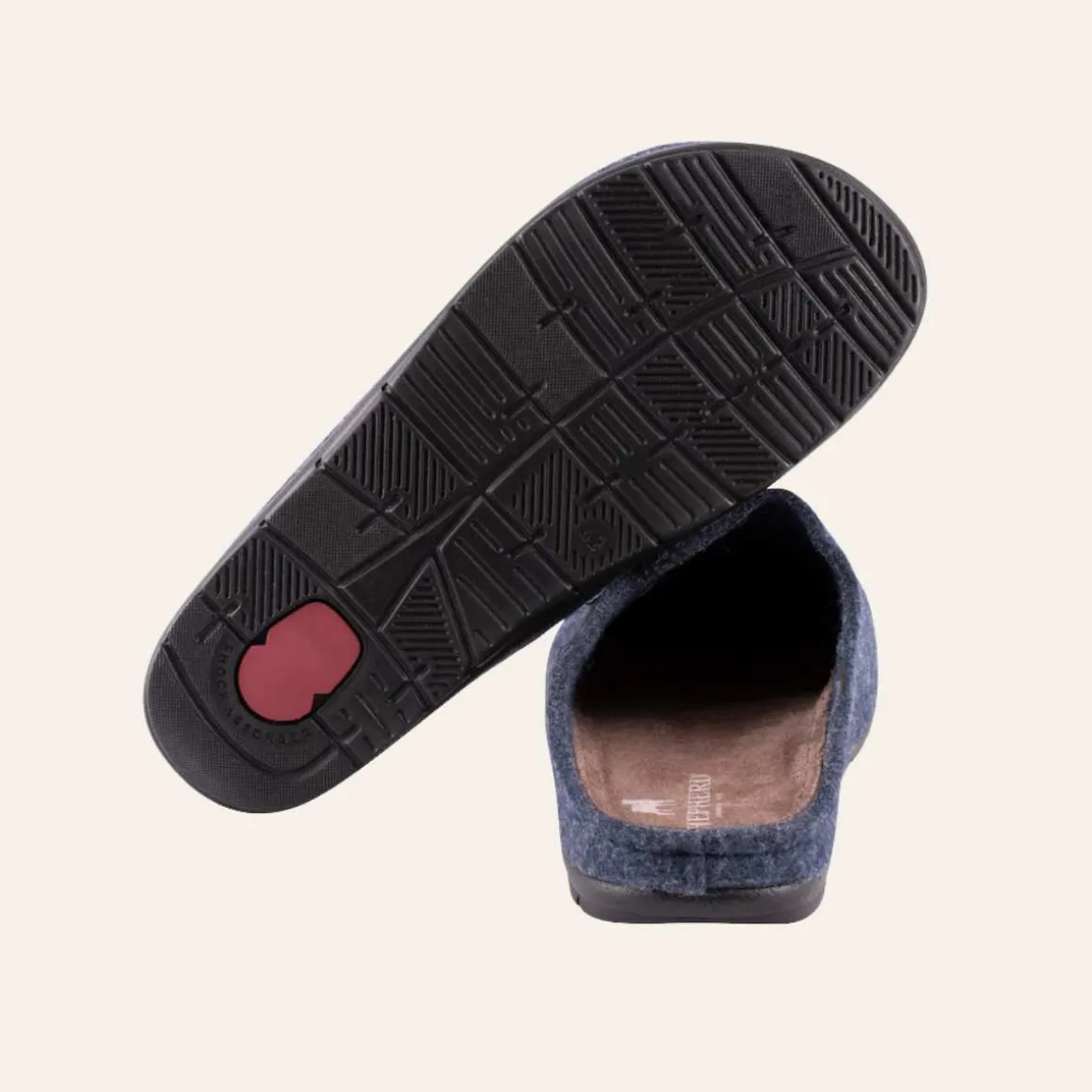 Shepherd Tøffel Samuel. Et par stabile og lette tøfler i ull. Tøflene er i en klassisk slip-in-modell og har en oppbygget innersåle i skinn med minneskum som tilpasser seg fotens form. Svært lett og myk yttersåle i gummi.