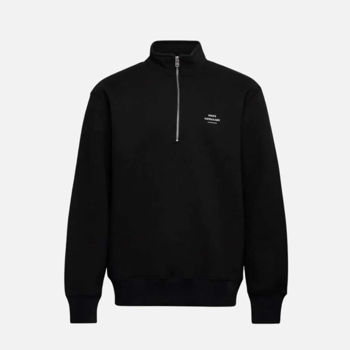 Mads Nørgaard sweatshirt Standard Half Zip Logo Sweat er laget av 65 % bomull og 35 % polyester med en myk børstet bakside. Passformen er vanlig, den har ribbede kanter og den høye halsen har glidelås.