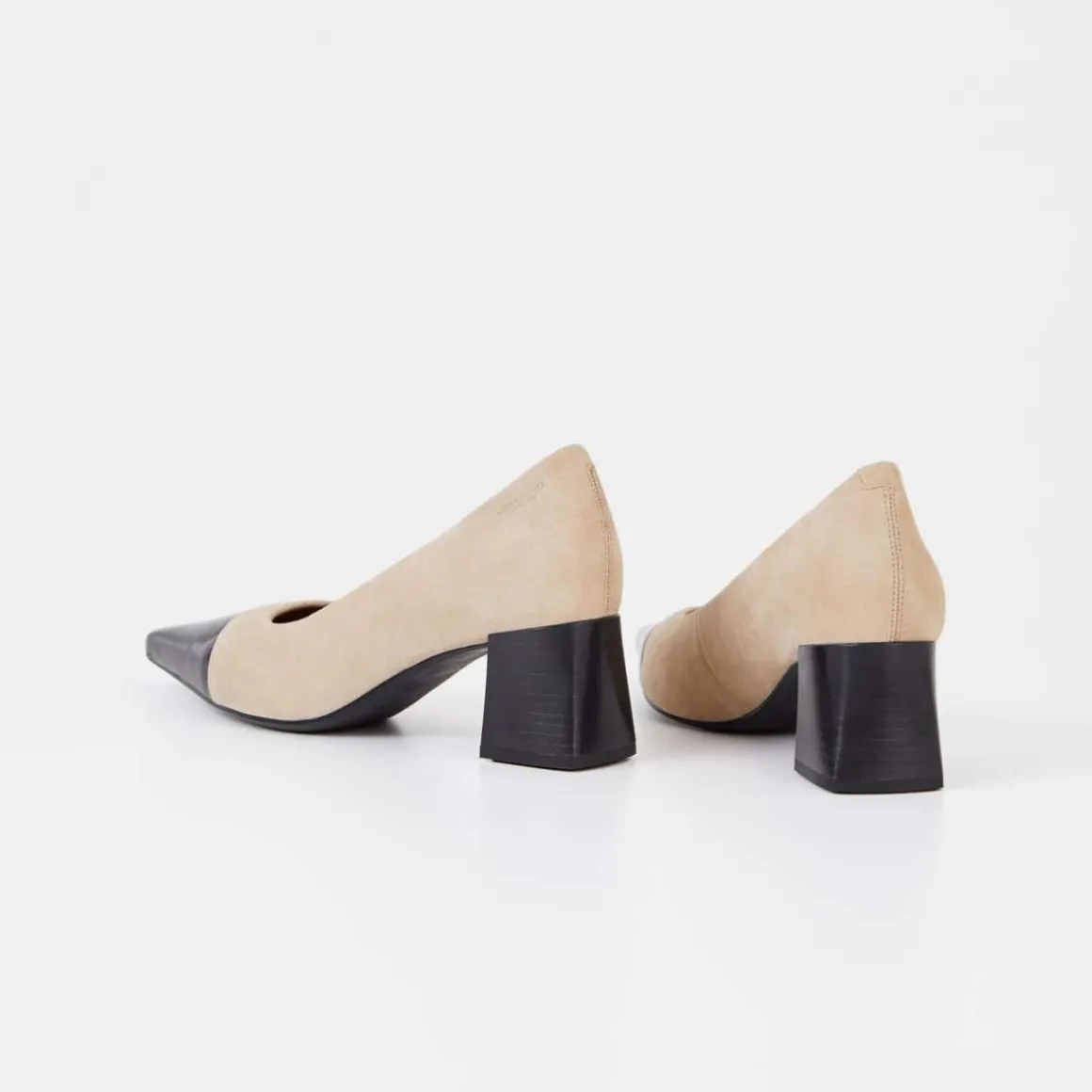 Altea fra Vagabond er stilige pumps med et elegant utseende. Modellen er i beige semsket skinn med tåhette i sort lakk, skinn/tekstilfôr og skinninnersåle. Detaljer inkluderer spiss tåform og en bred blokkhæl som måler 58 mm.
