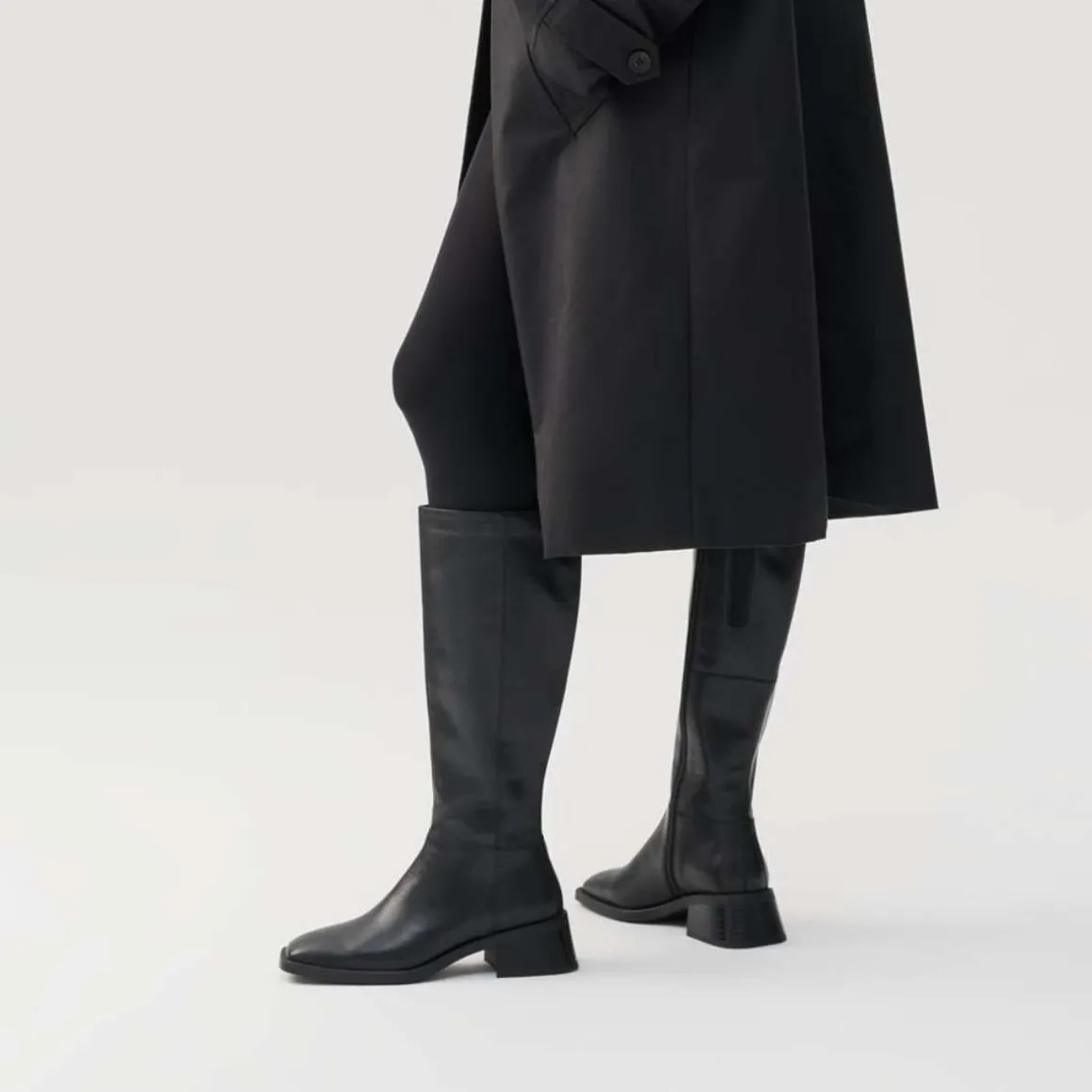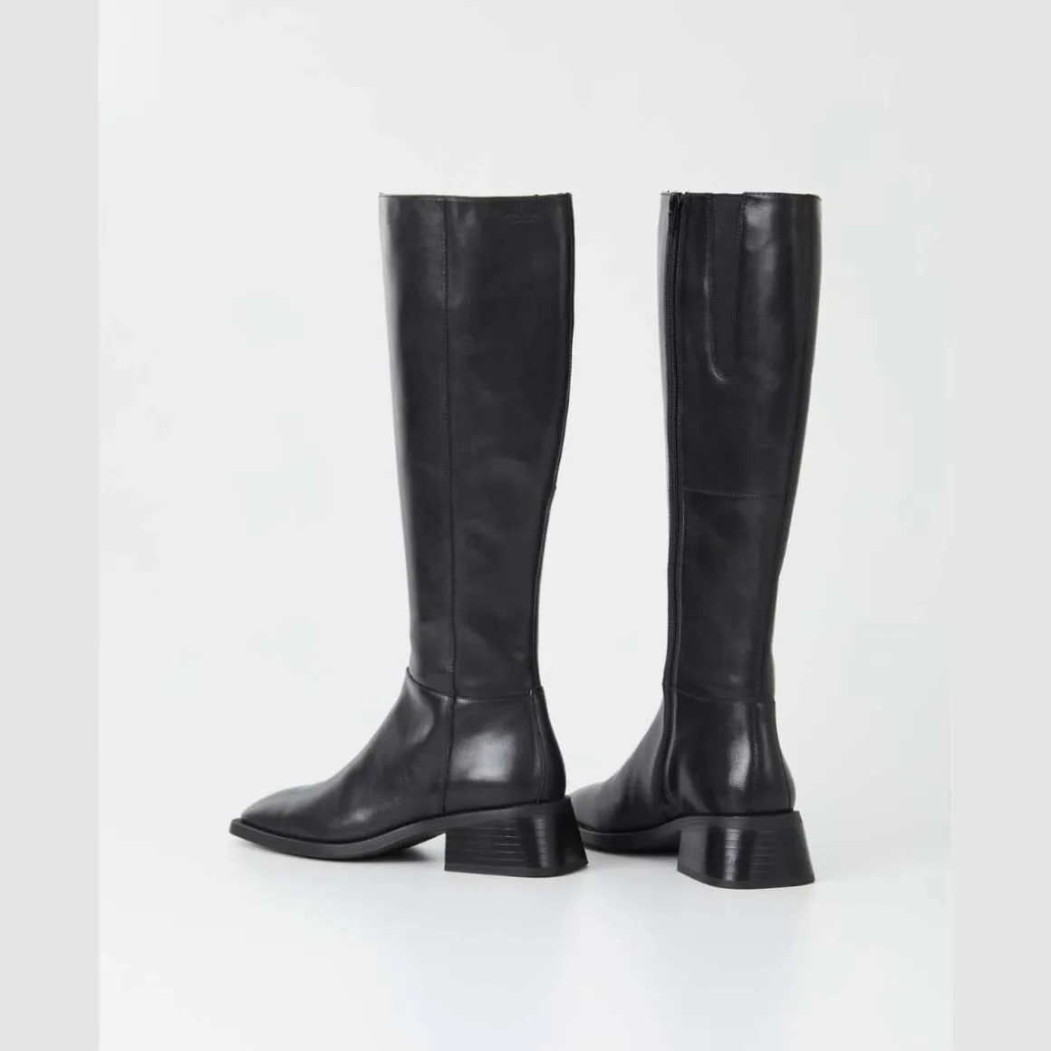 Blanca er et ekte Vagabond-ikon. Den knehøye støvletten er laget i sort skinn og har en subtilt firkantet tåform. Hælen er lett utsvingt og måler 47 mm. Detaljer inkluderer glidelås langs innsiden, en midtsøm samt innersåle i kromfritt skinn.