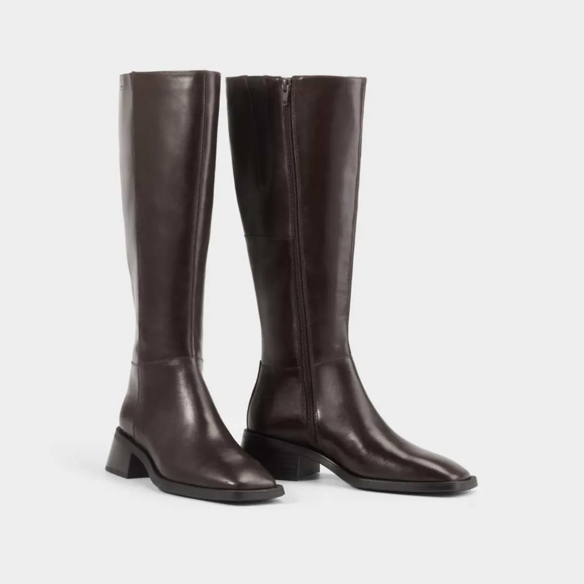 Blanca er et ekte Vagabond-ikon. Den knehøye støvletten er laget i mørkebrunt skinn og har en subtilt firkantet tåform. Hælen er lett utsvingt og måler 47 mm. Detaljer inkluderer glidelås langs innsiden, en midtsøm samt innersåle i kromfritt skinn.