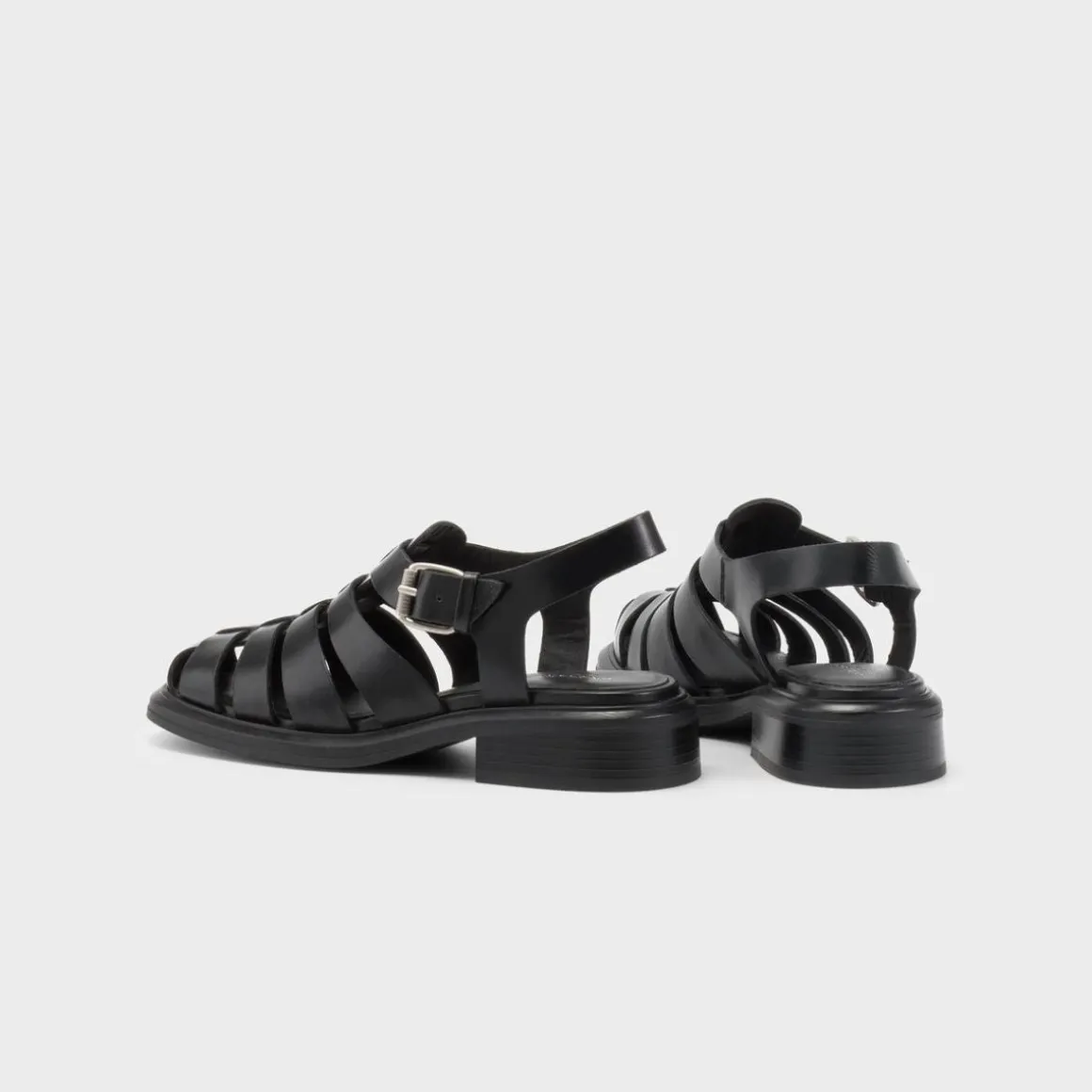 Ellis fra Vagabond gir en moderne vri på fiskersandalen. Modellen er laget av svart skinn og har en flettet overdel, avrundet tåform og en justerbar ankelrem med en sølvfarget spenne. Hælene måler 25 mm.