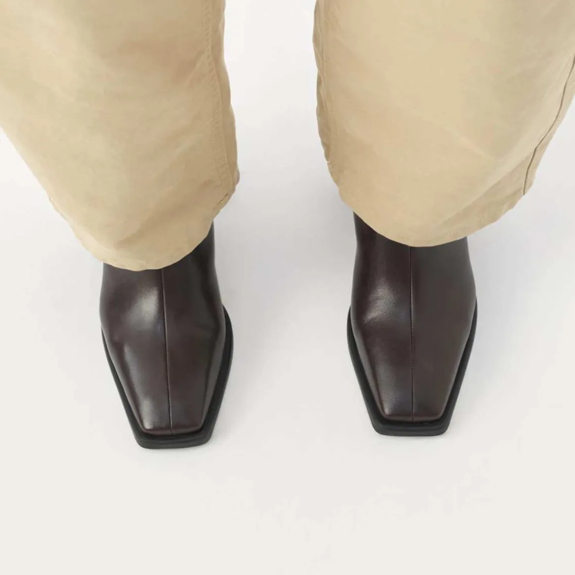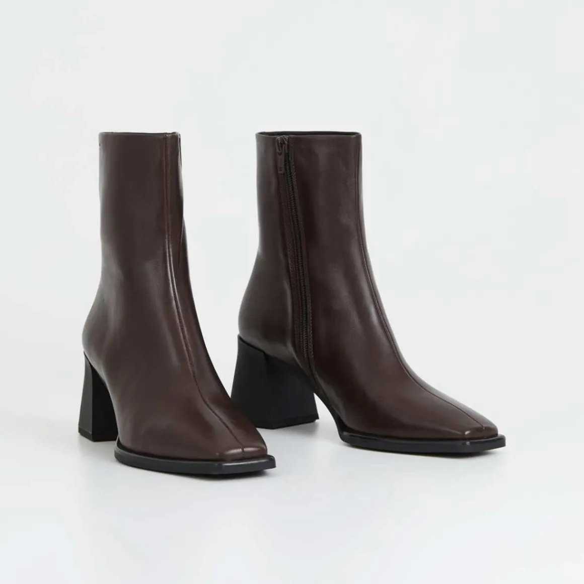 Vagabond Edition Hedda har et tidløst design. Modellen er laget i mørkebrunt skinn og har en subtilt firkantet tåform. Detaljer inkluderer en midtsøm, glidelås langs innsiden av skaftet og en 70 mm utsvingt hæl. Innersålen er i kromfritt skinn.