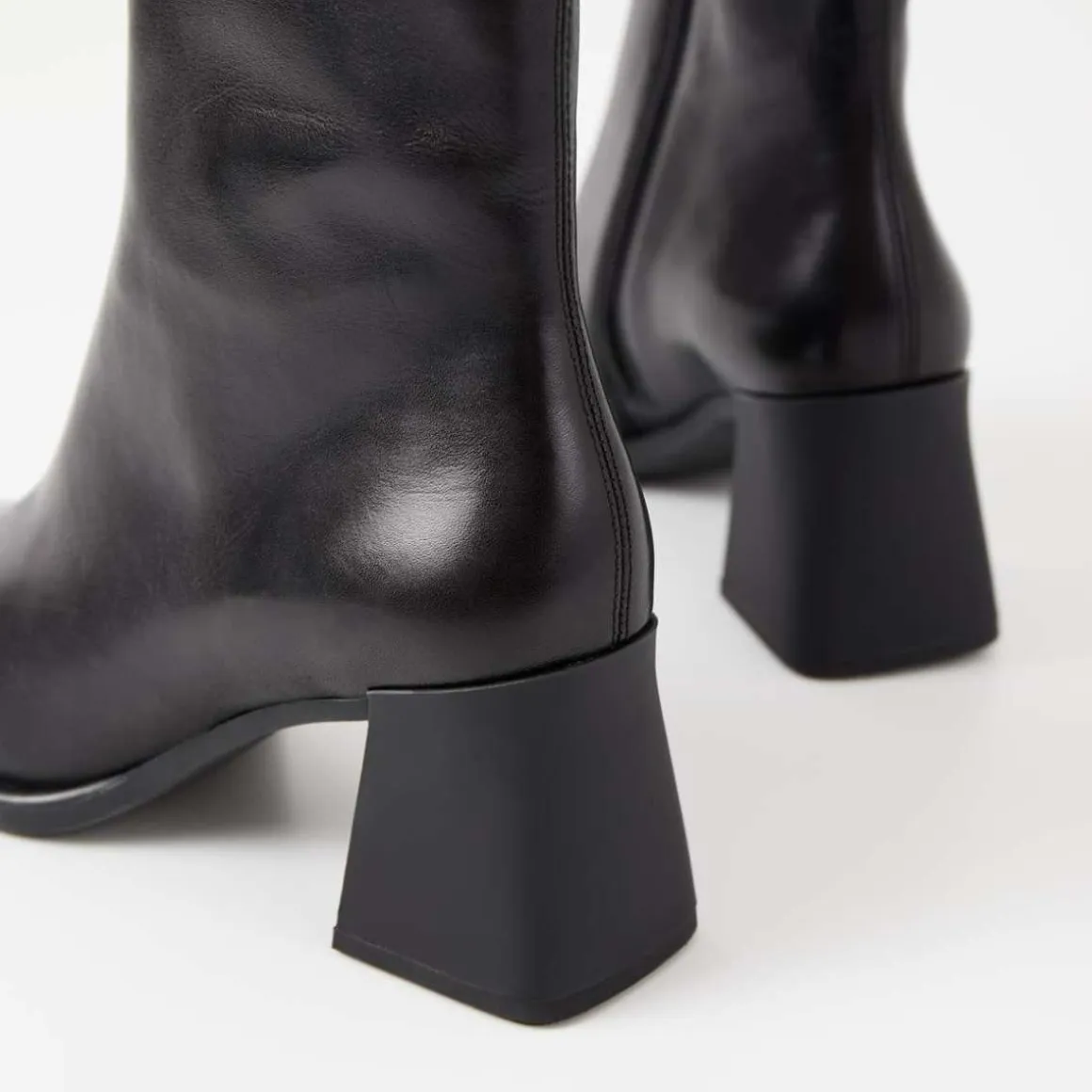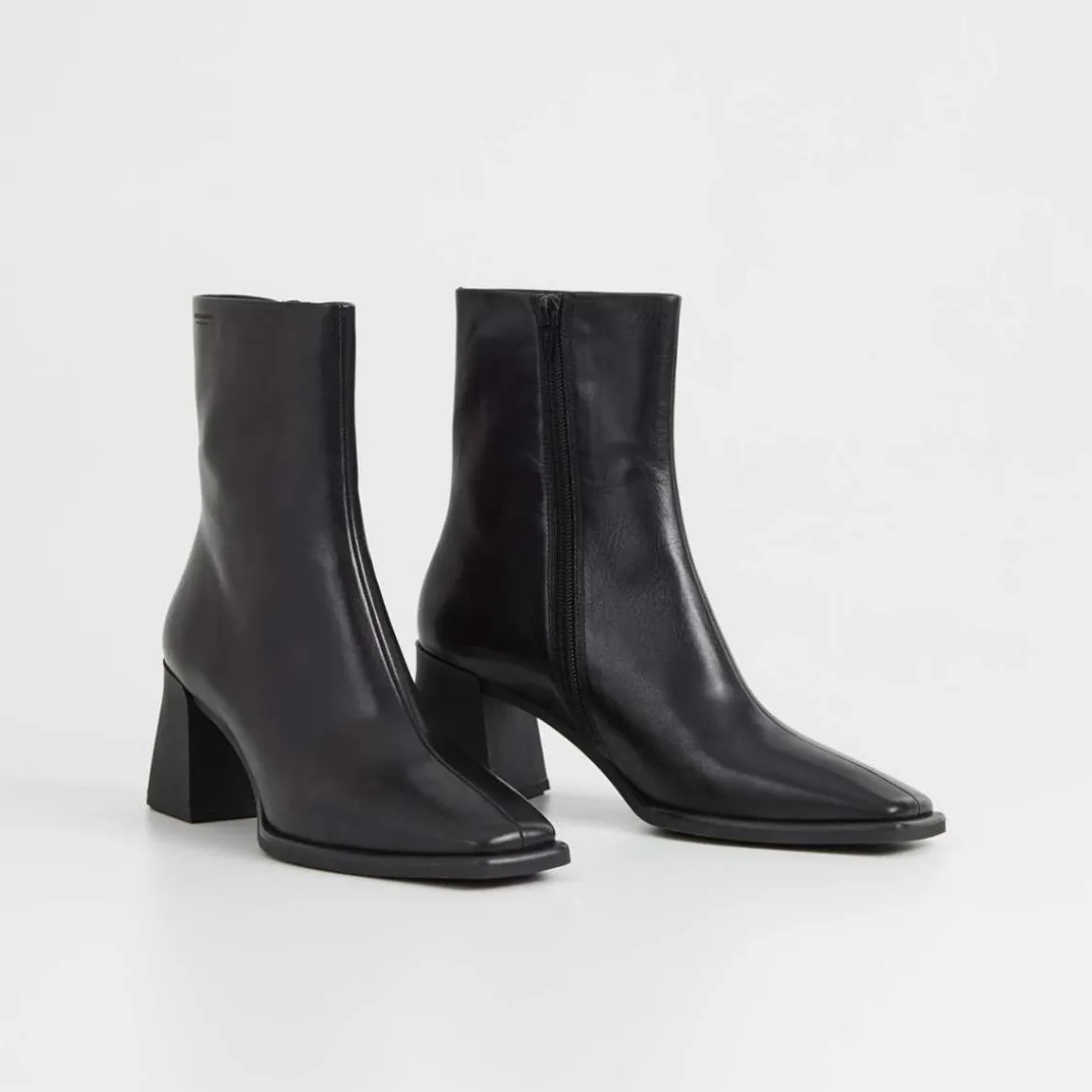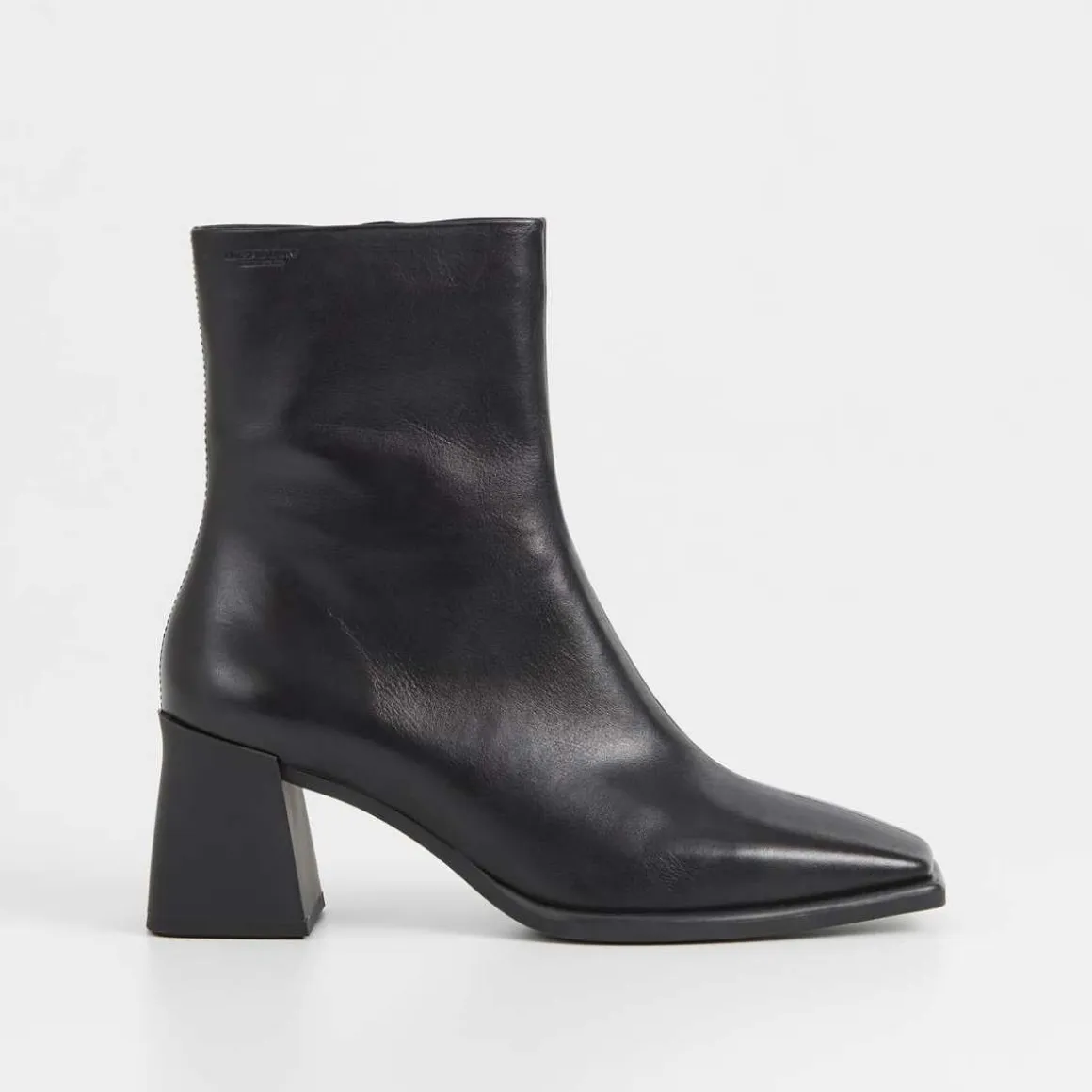 Vagabond Hedda. Hedda er en moderne ankelstøvletter med en retro-estetikk. Skoen er laget i glatt, svart skinn med firkantede tær, et skaft i middels høyde og glidelåser på innsiden. De utsvingte hælene måler 70 mm.