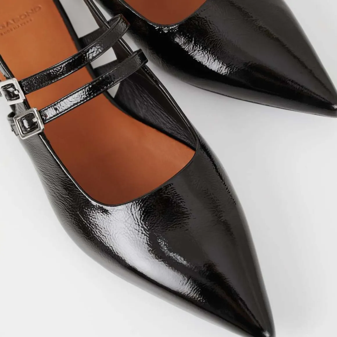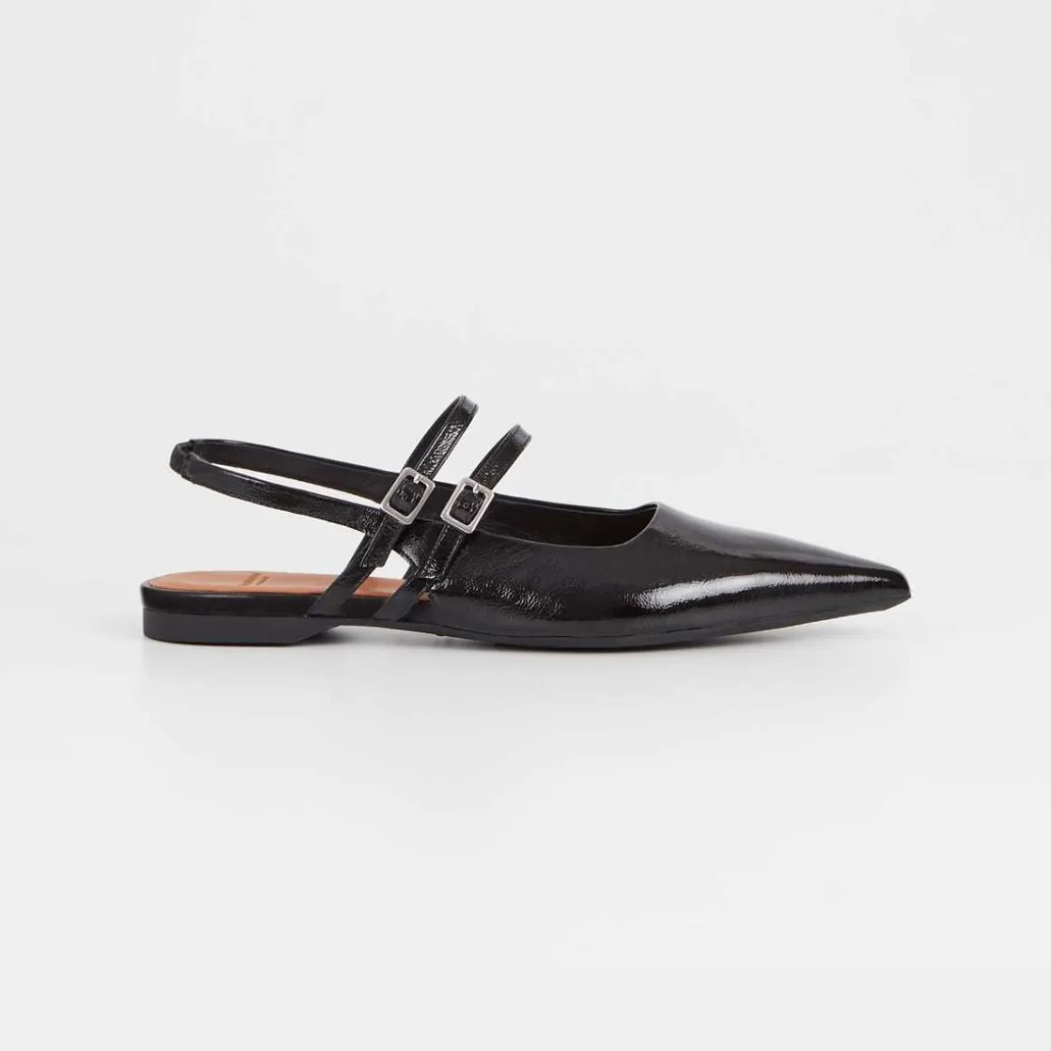 Hermine fra Vagabond er slingback-sko med en avsmalnende silhuett. Modellen er laget i svart, lakkert skinn med elastisk hælstropp og doble, justerbare stropper med sølvfarget spenne over foten. Detaljer inkluderer spiss tåform, skinnfôr og innersåle i skinn. Hælen måles til 10 mm.
