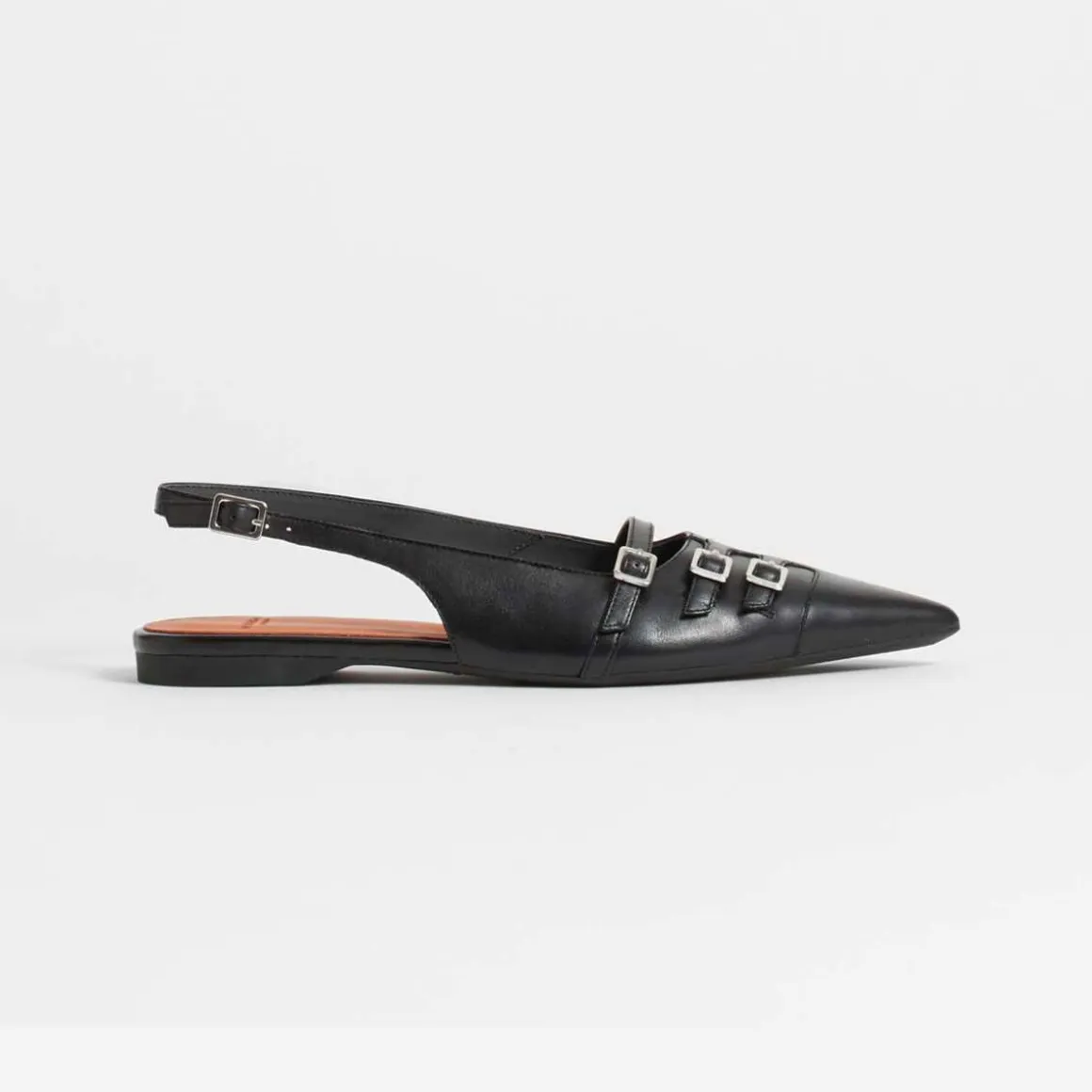 Hermine er dristige slingbacks med et elegant utseende. Modellen er laget i svart skinn med sølvfargede spennedetaljer, spiss tå og en justerbar spenne ved ankelen. Den lave hælen måles til 10 mm.