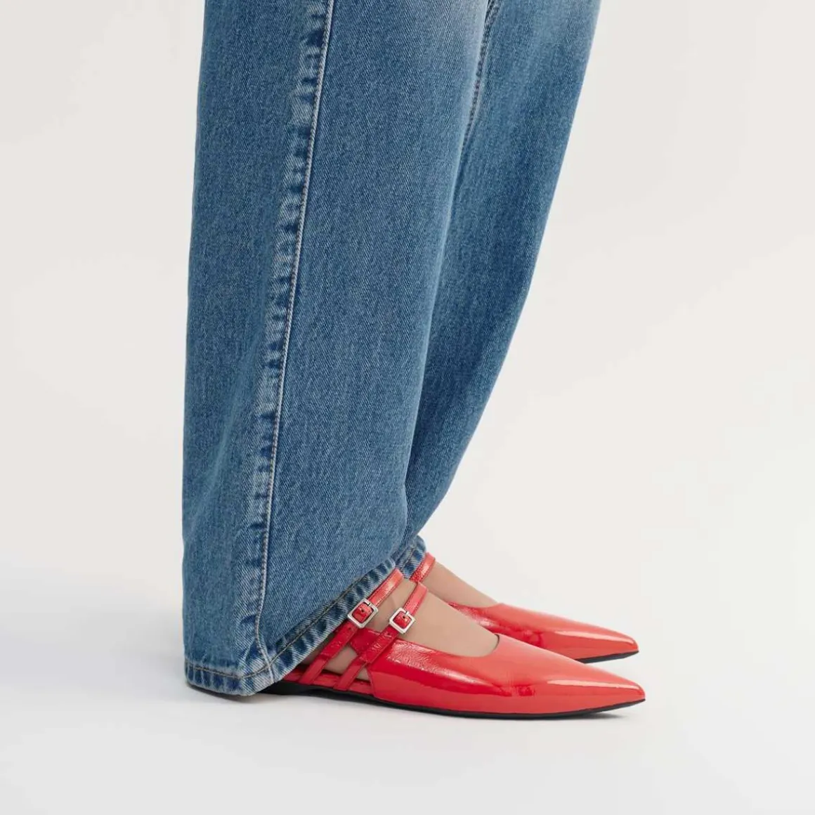 Hermine fra Vagabond er slingback-flats med et dristig uttrykk. Modellen er laget i rødt lakkert skinn med spiss tå, slingback-stropp og doble, justerbare stropper med sølvfargede spenner. Den lave hælen måler 10 mm. Detaljer inkluderer innersåle i skinn og skinnfôr.