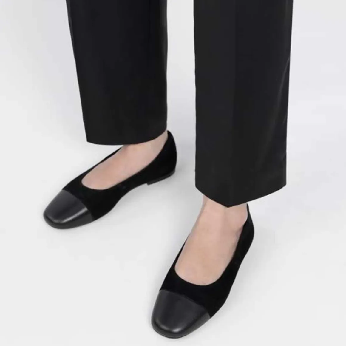 Jolin er klassiske ballerinasko fra Vagabond med en oppdatert look. Modellen er laget i svart, semsket skinn og har en tåhette i svart skinn og rund tå. Den tynne yttersålen har en 11 mm lav hæl.