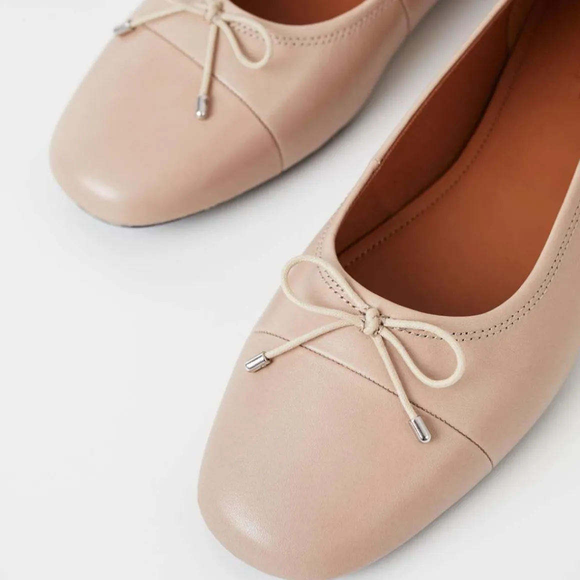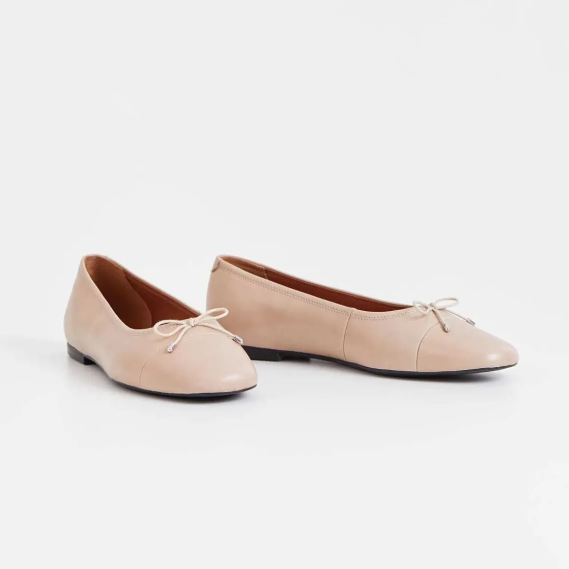 Jolin er klassiske ballerinasko med en strippet silhuett. Modellen er i beige skinn med avrundet tå og dekorativ sløyfe foran. Den pene sålen har en 11 mm lav hæl. Detaljer inkluderer tekstilfôr og skinninnleggssåler.