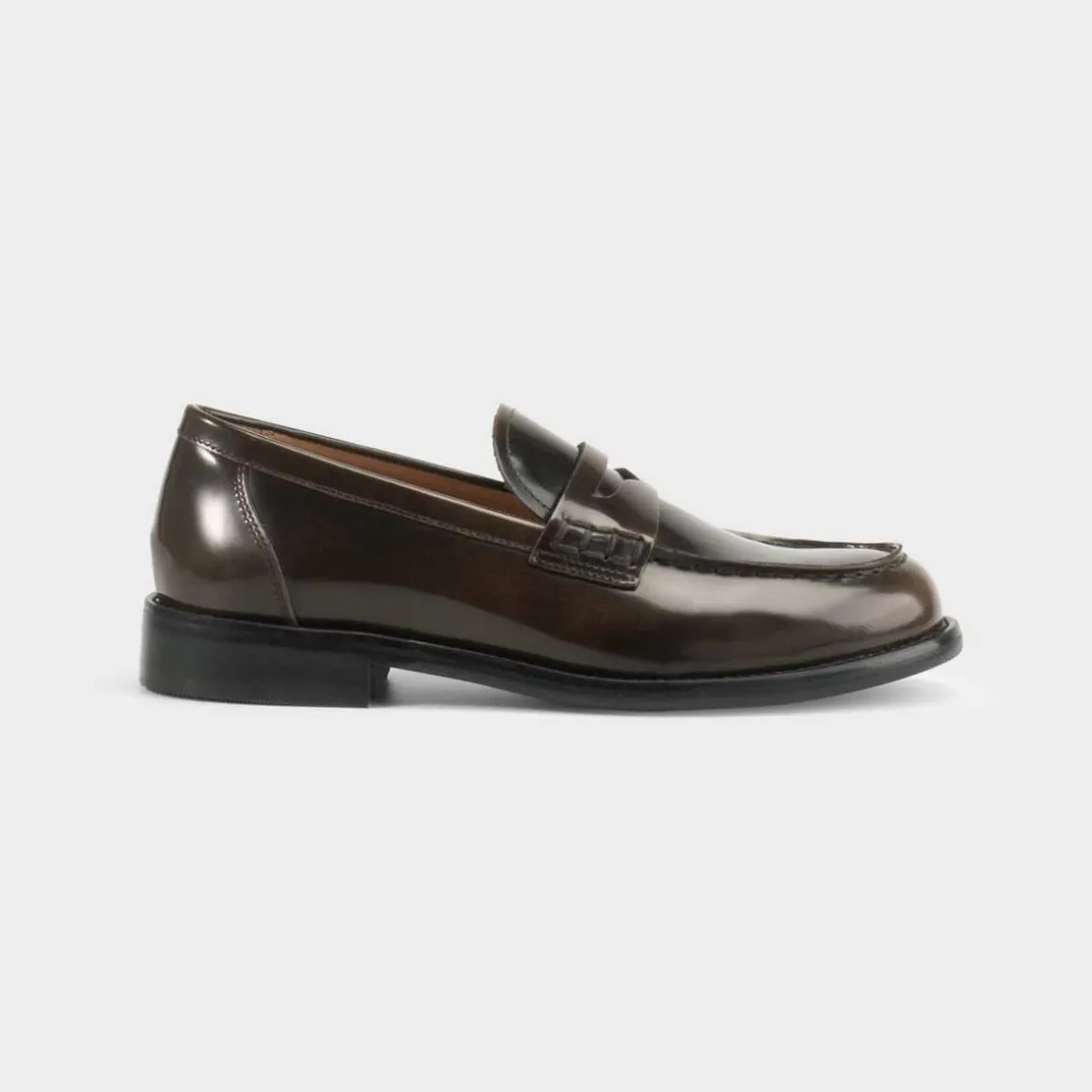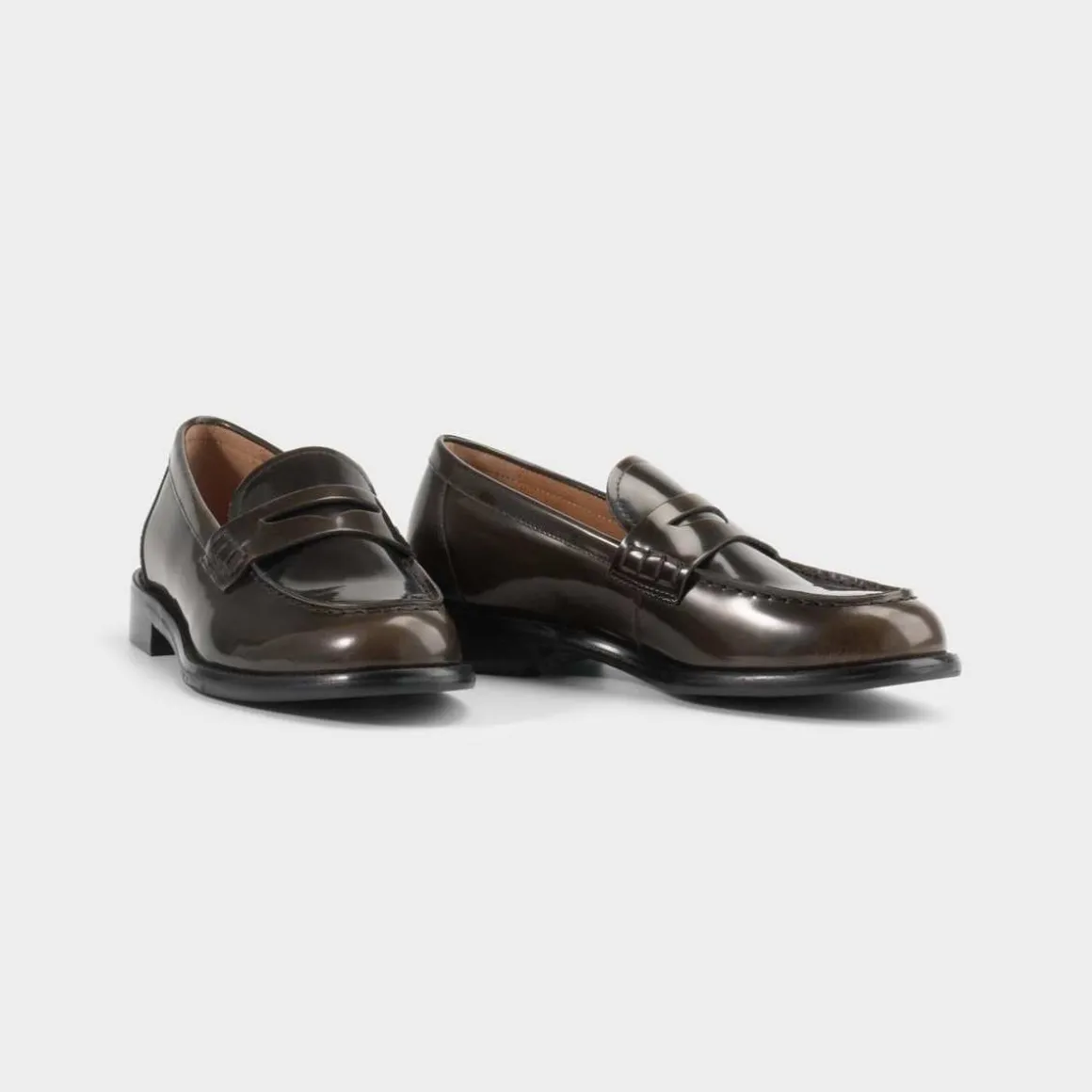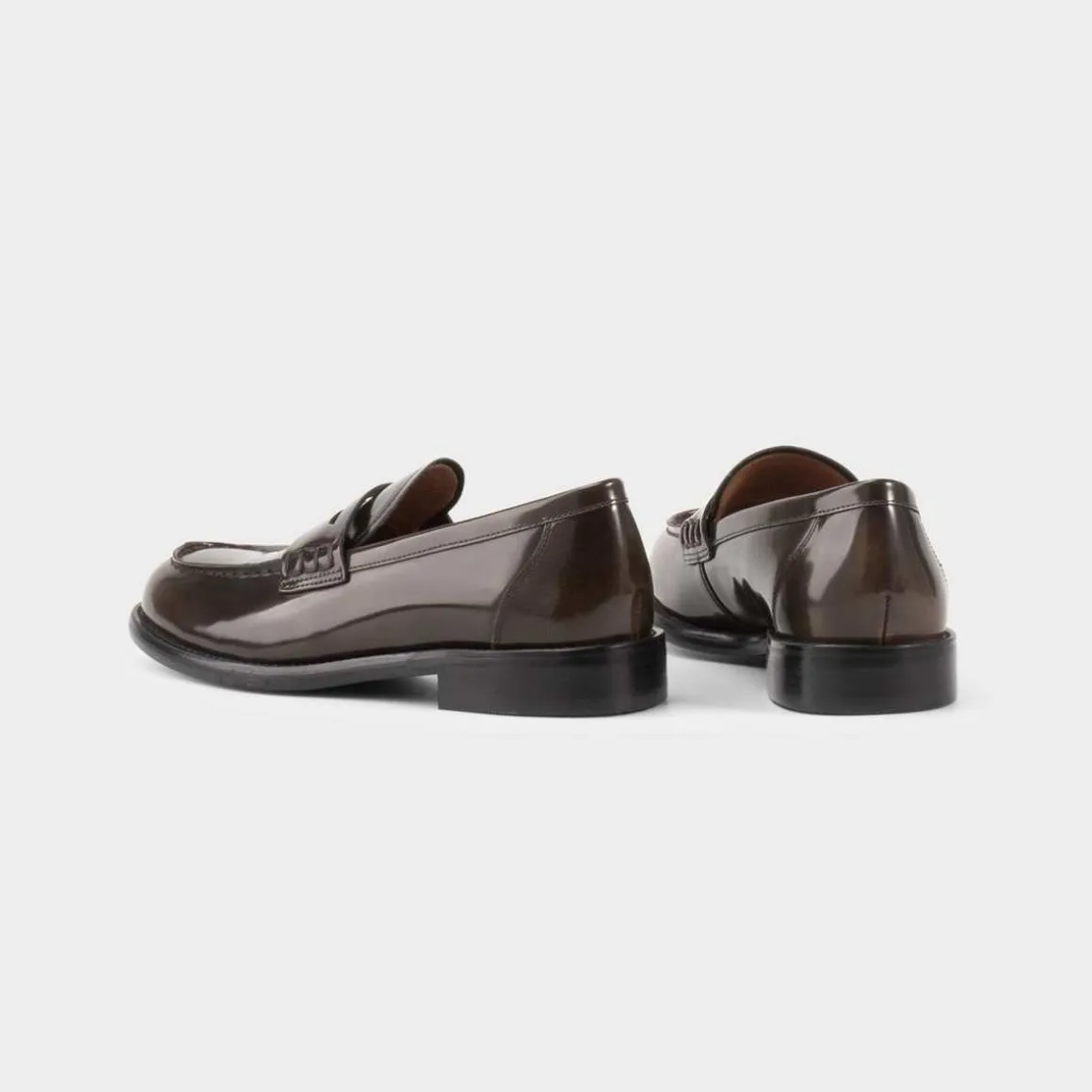 Vi mener at Linn er den perfekte penny loaferen. Den klassiske modellen i mørkebrunt, polert skinn har en moc-tåsøm, med innersåle og fôr i skinn. Yttersålen har en tynn gummidel som gir godt grep.