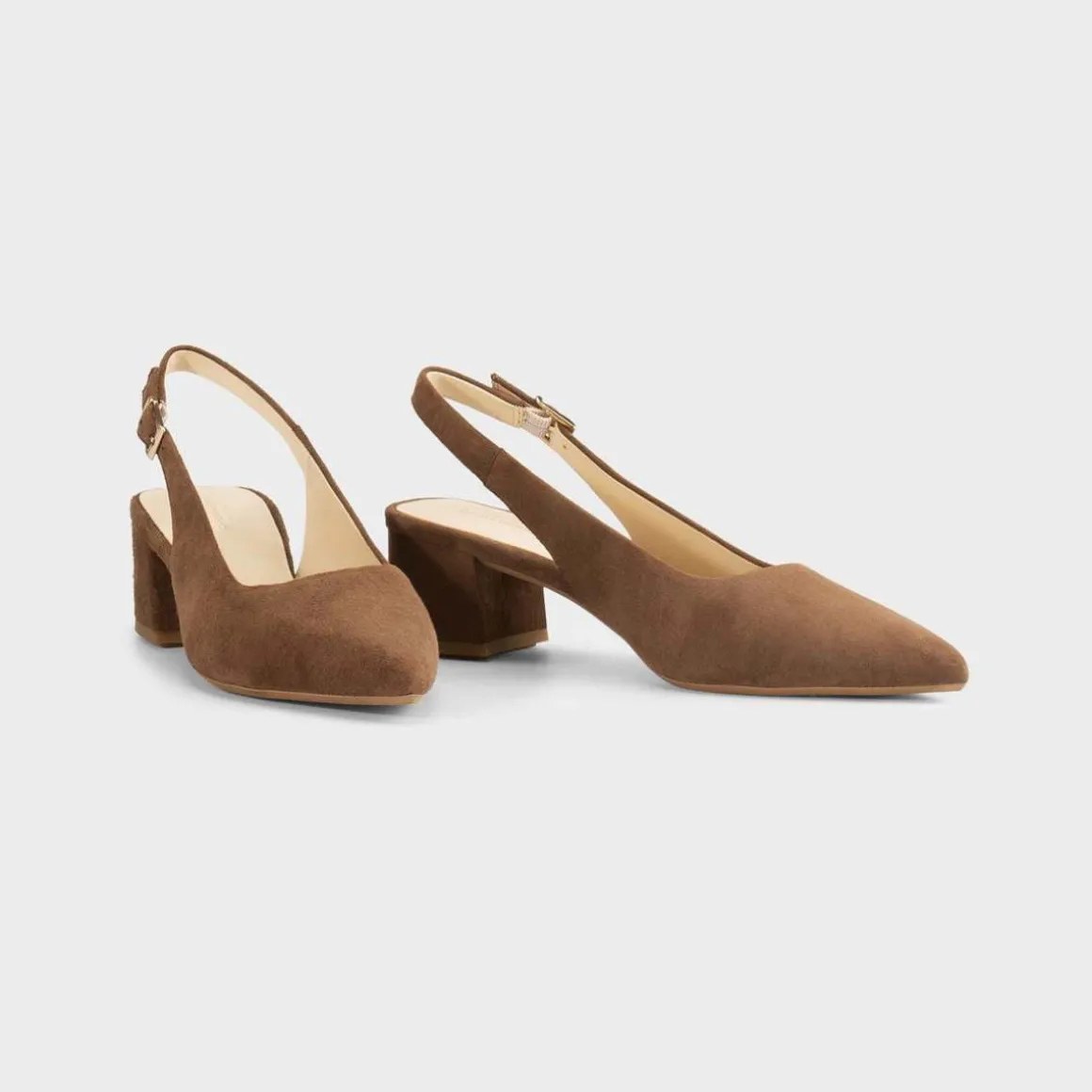 Marta fra Vagabond er et par moderne slingbacks med en raffinert silhuett. Laget av brunt semsket skinn, har disse hælene en subtilt spiss tåform og en justerbar slingback-rem med spenne. Blokkhælene måler 50 mm, og detaljene inkluderer polstrede skinninnersåler.