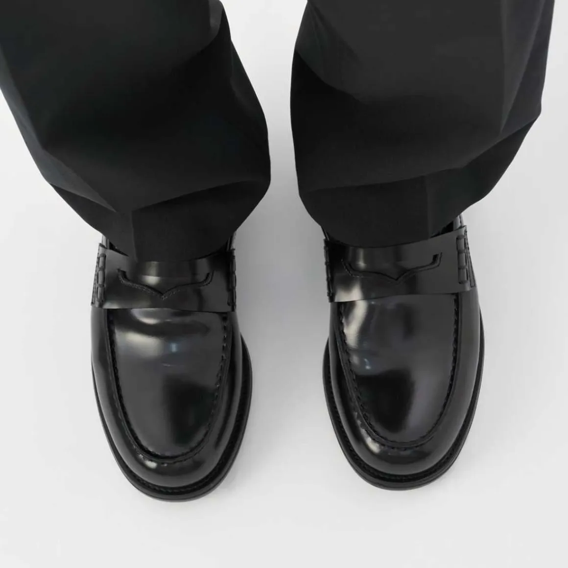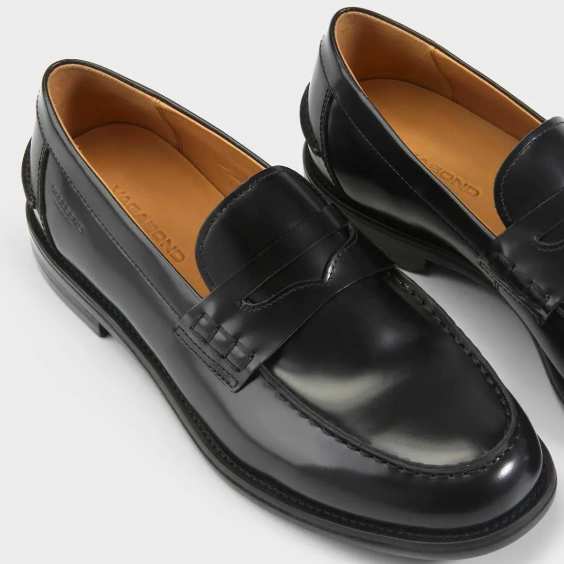 Vi omtaler vanligvis Steven som den perfekte loaferskoen. Penny-designet er laget av polert svart skinn og har en mokkasinsøm, skinnfôr og innersåle i skinn. Yttersålen har en tynn gummipute – noe som gir godt grep.