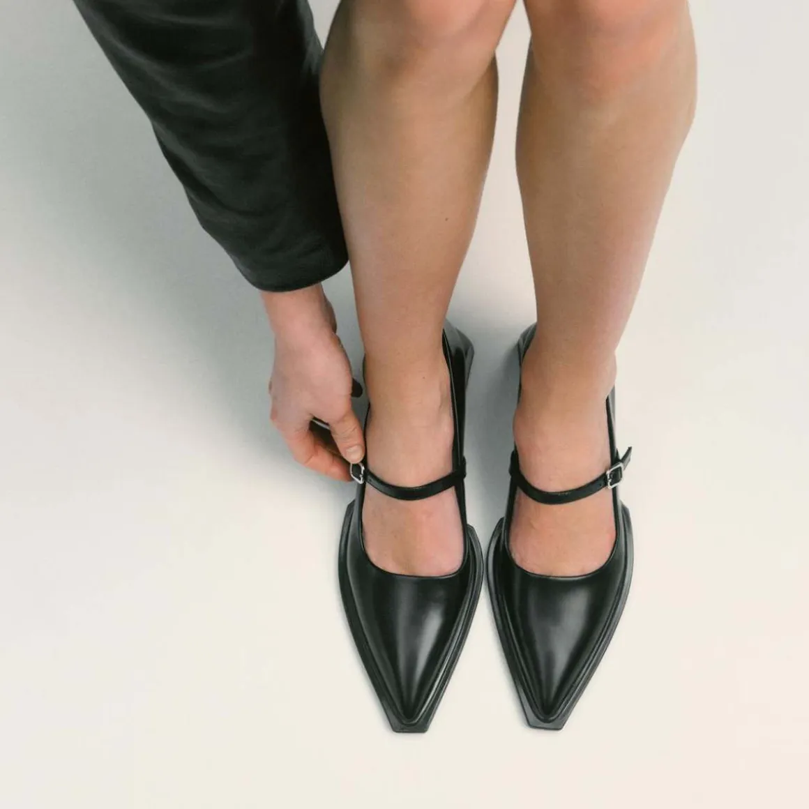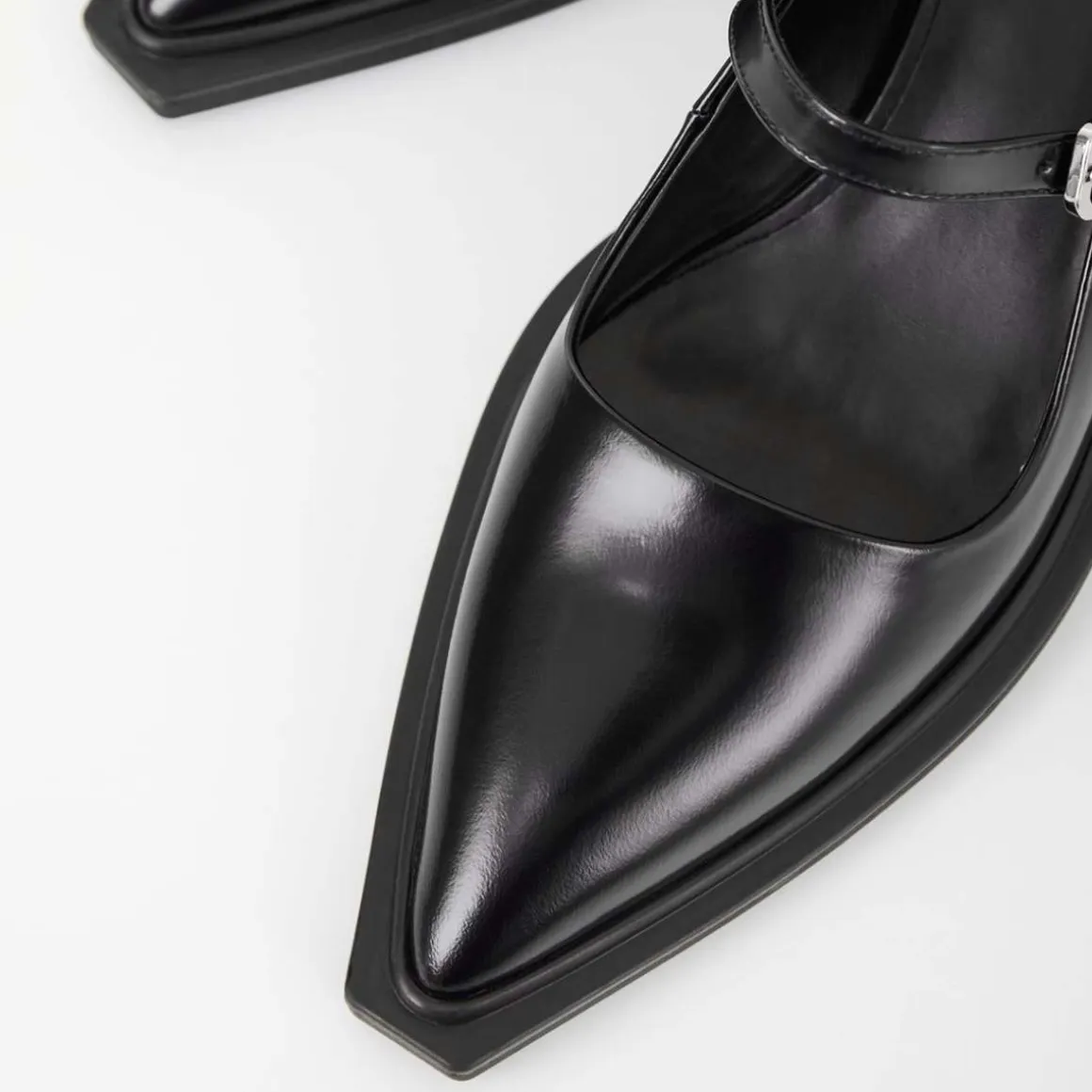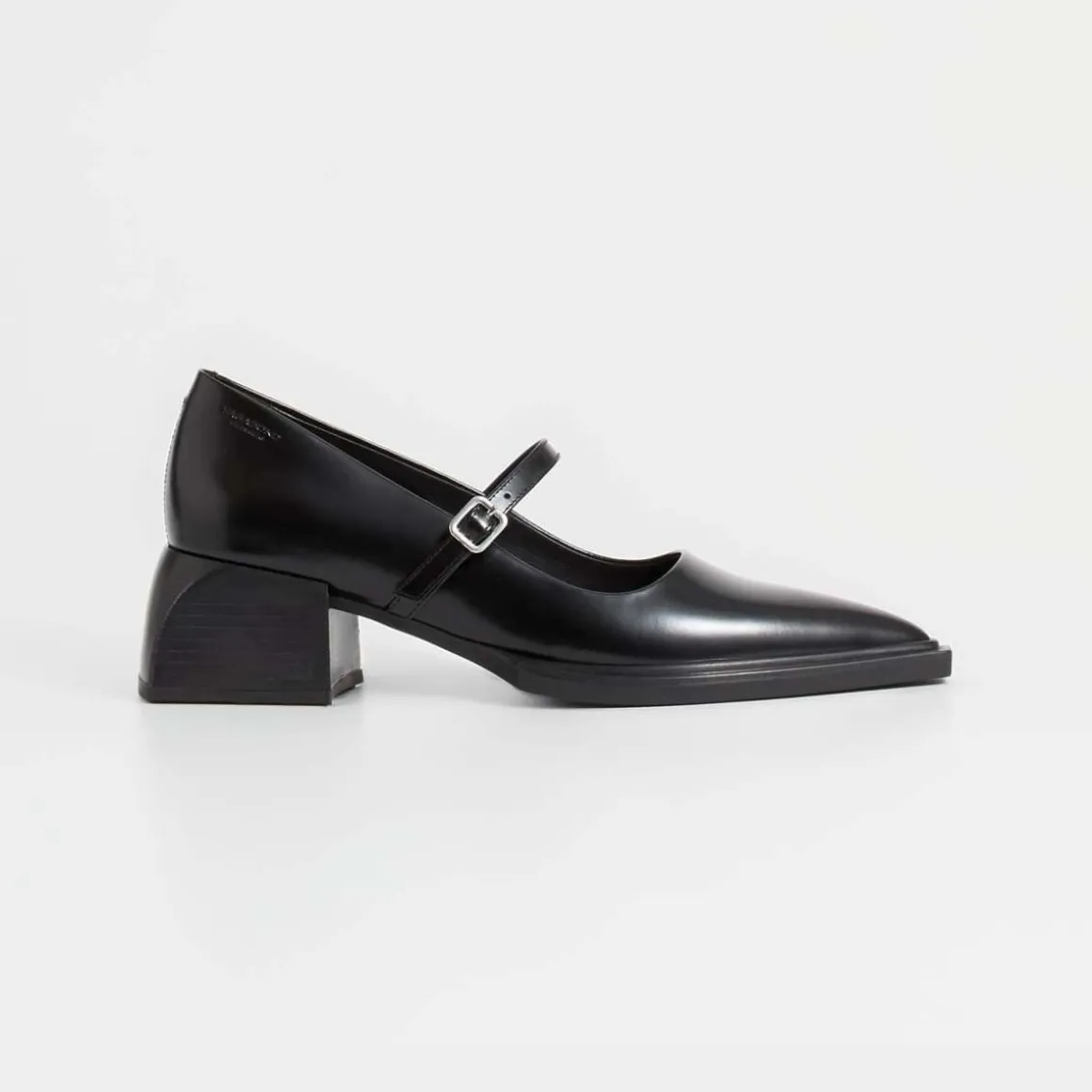 Vivian er moderne Mary Jane-inspirerte pumps med en edgy silhuett. Modellen er laget i svart, polert skinn med skarp, spiss tå og en justerbar stropp med sølvfarget spenne. Den skulpturerte hælen måler 55 mm.