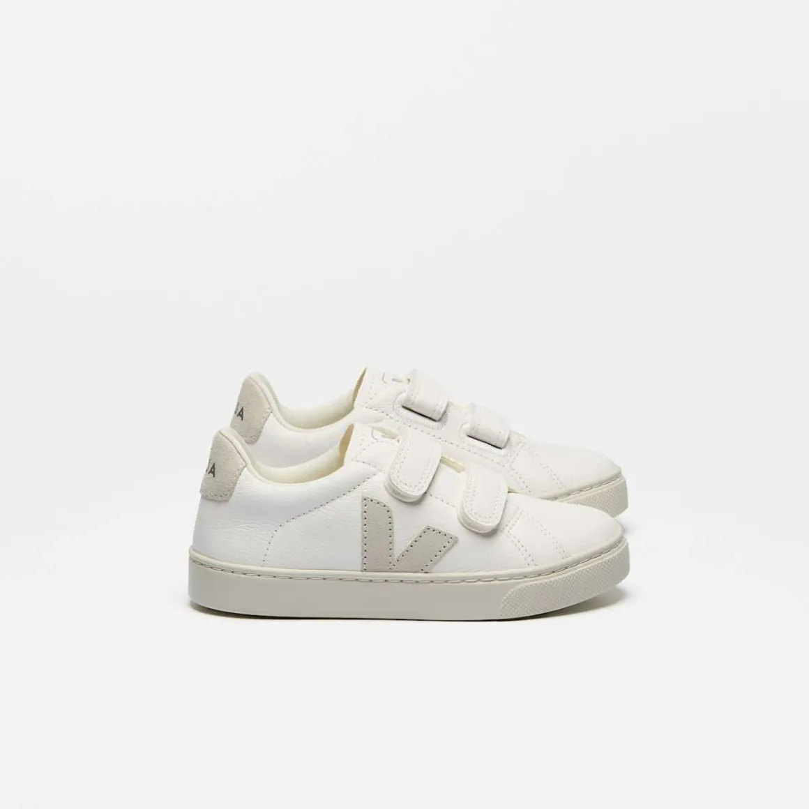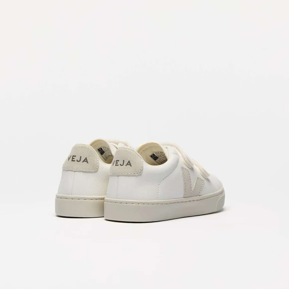 VEJA Esplar Kids er en stilren og komfortabel barnesneaker i klassisk hvit med beige-detaljer. Modellen er laget i organisk sporet skinn (O.T.), som sikrer sporbarhet og ansvarlig produksjon gjennom hele verdikjeden.