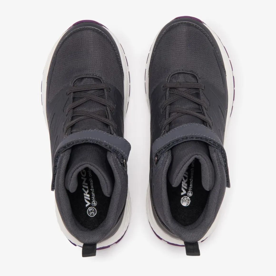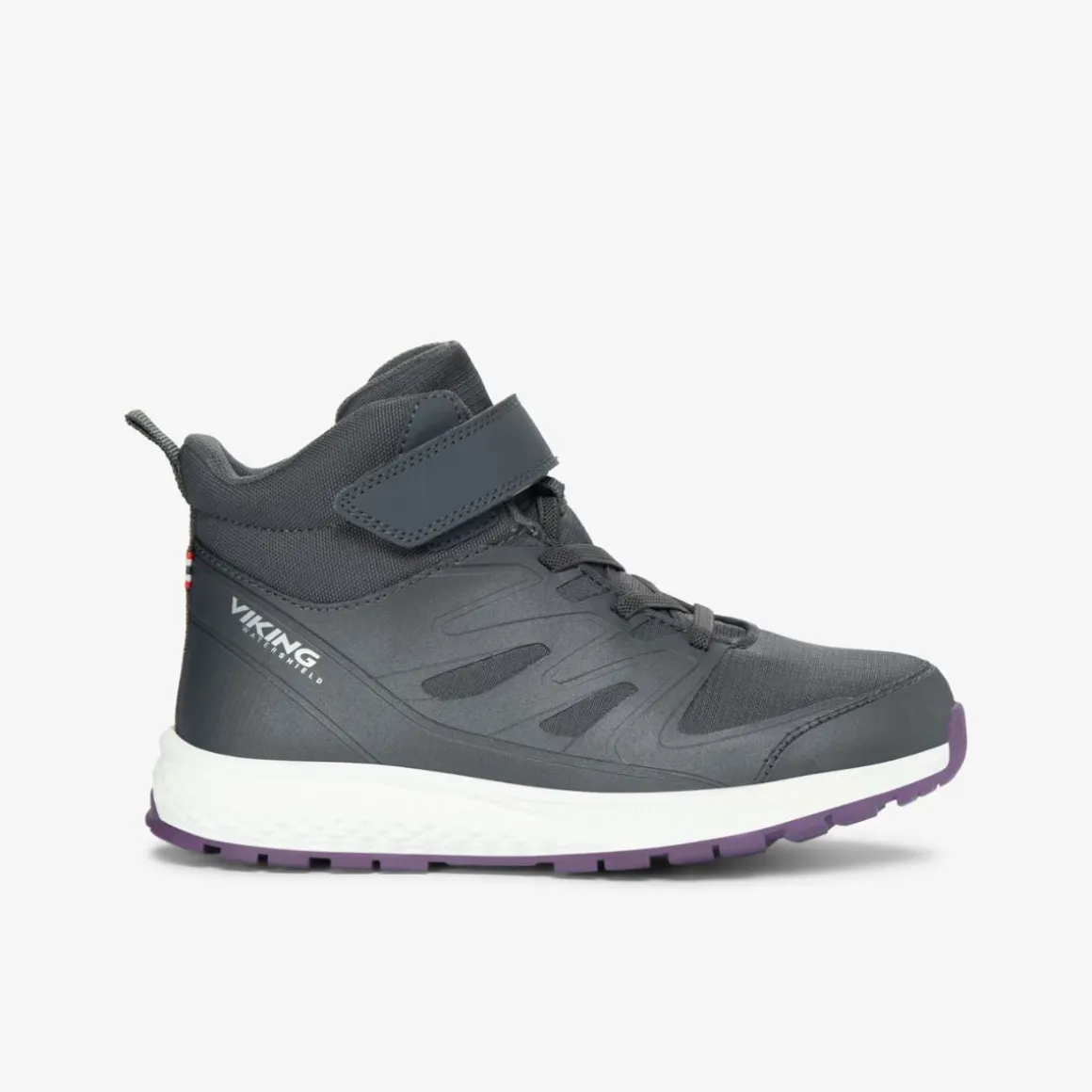 Utstyr ditt barns føtter med solide og vanntette sko som takler alt dagen bringer. Den forsterkede overdelen har en slitesterk støtte-ramme og en høyere skaft for ekstra støtte og stabilitet. Speed laces sikrer en tett passform og gjør av- og påkledning enkel. En lett EVA-mellomsåle demper hvert steg, mens en full gummisåle gir godt grep på de fleste overflater. I våte forhold holder Viking’s Watershield-membran føttene tørre.